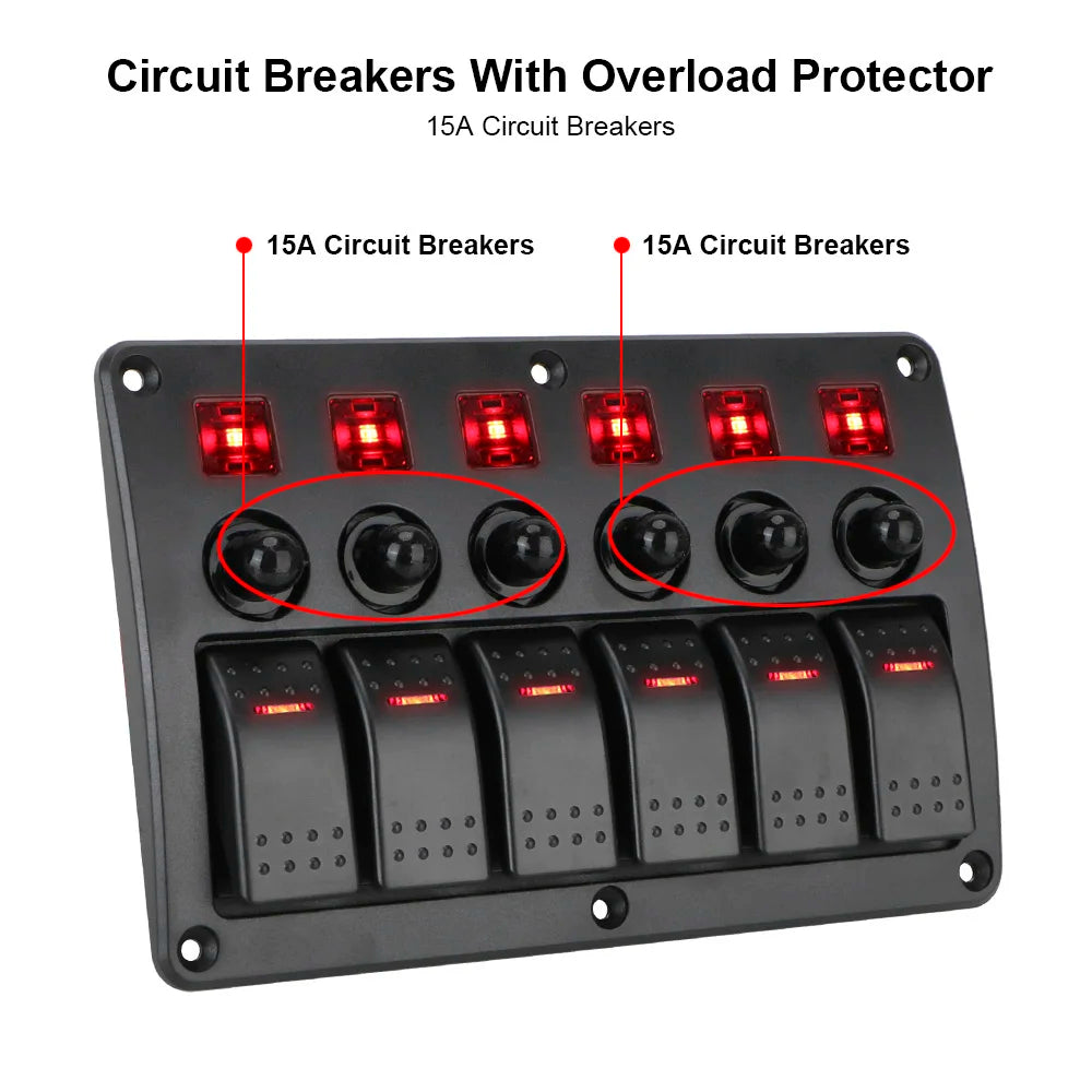 - Includes: 6 on-off LED rocker switches with rubber seals and 6 circuit breakers; pre-wired with wiring instructions
