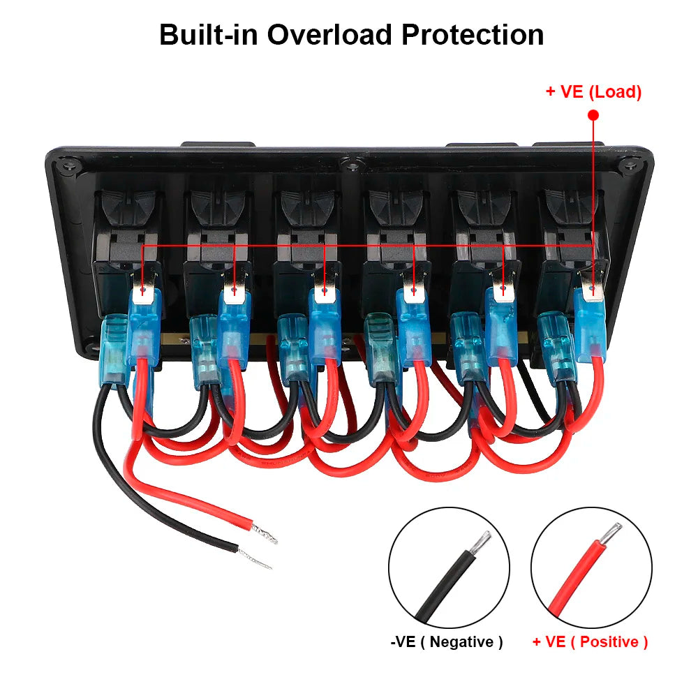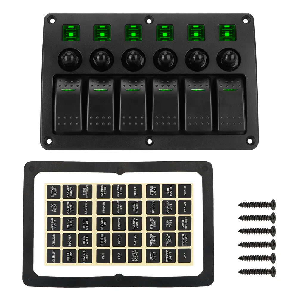 Engineered for reliable, organized power control in vehicles, boats, trailers, and heavy-duty transport, the Vehicle Switch Panel 24V and 12V offers a compact, rugged solution with six LED-illuminated rocker switches and built-in circuit protection. Each switch lights only when active, giving you clear, at-a-glance status in any lighting condition. Six integrated circuit breakers automatically cut power in case of overload, helping safeguard your devices and electrical system. The panel is scratch-proof and corrosion-resistant thanks to its ABS + aluminum face, with rubber-sealed sockets that stay dust-tight and debris-proof in tough environments. Designed for versatile installation, it can be mounted horizontally or vertically and comes pre-wired with wiring instructions for straightforward setup.