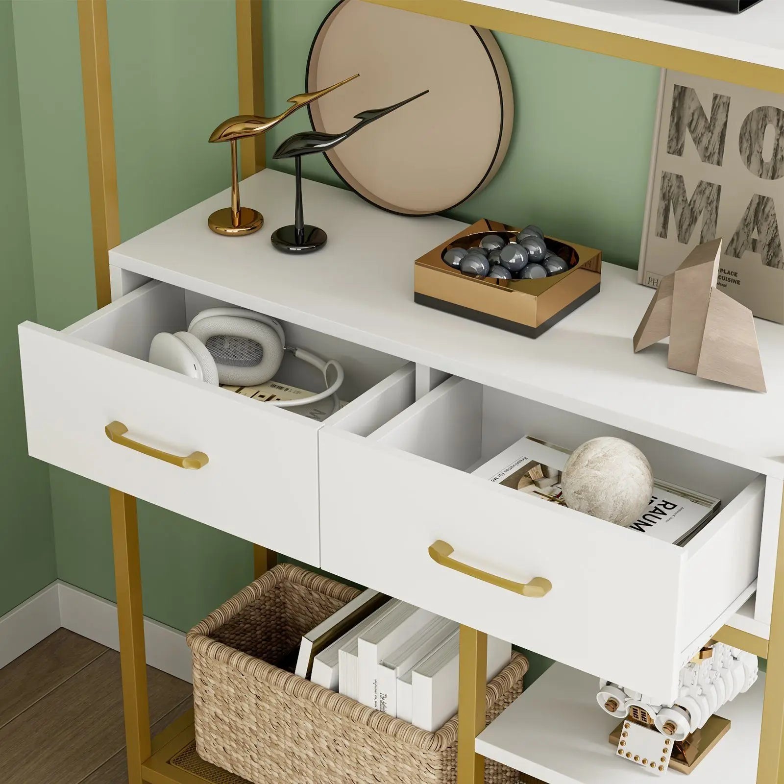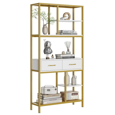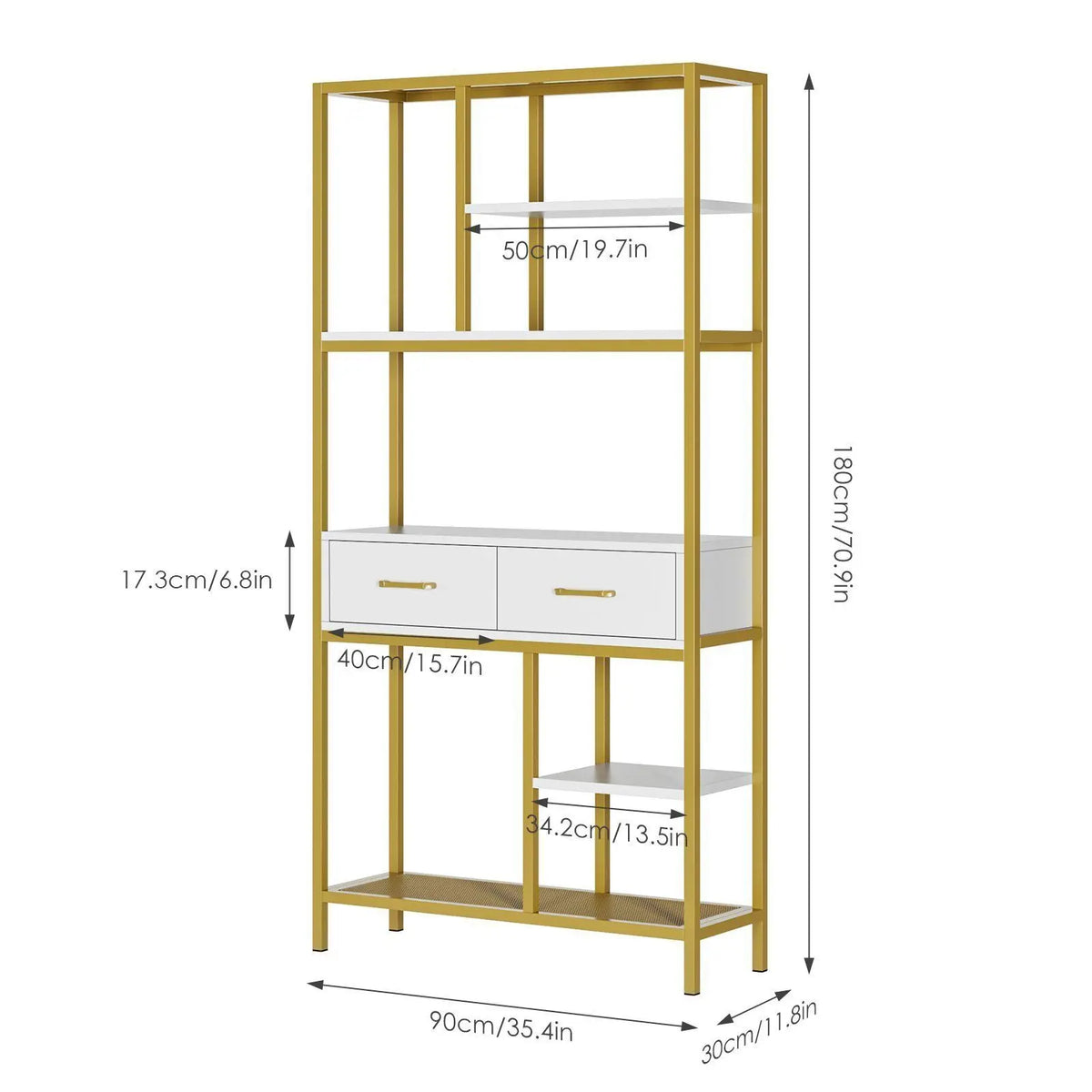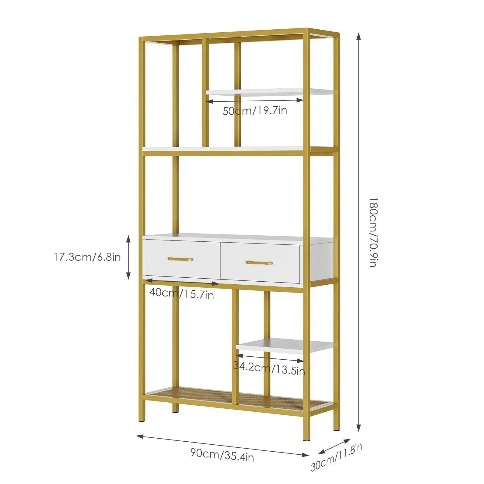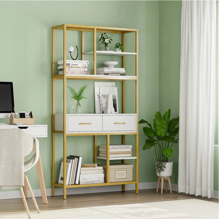 Meet the Wood And Metal Office Shelf Rack With Five Compartments — a versatile, five-tier storage solution designed to organize books, magazines, trophies, and décor while adding an industrial-chic touch to any space. Crafted with a sturdy metal frame and durable wooden planks, this shelf stays smooth and resilient, resisting scratches for long-lasting use. The 5 open compartments plus 2 drawers provide ample storage for both display and concealment. The smart, modular design lets you install the upper and lower partitions on the left or right, so you can tailor the shelf to fit your room layout and workflow. Ideal for offices, studies, living rooms, balconies, and entryways, it elevates organization without sacrificing style.