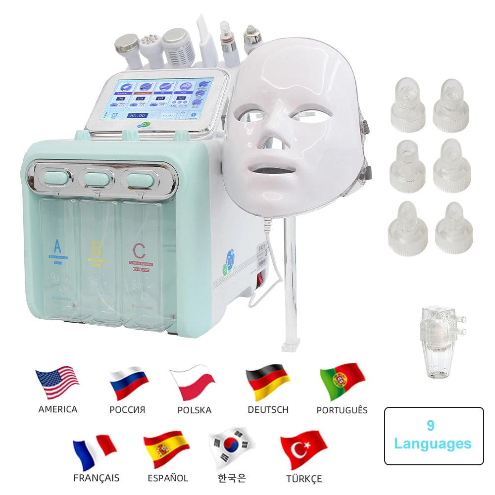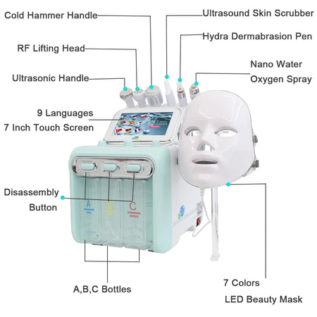 - Key features: Nano Water Oxygen Spray, Ultrasonic Handle, Cold Hammer Handle, Skin Scrubber, Water Dermabrasion Pen, BIO Lifting Head, LED Mask