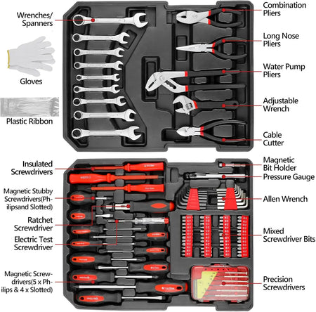 - Pliers, Drills, Hammers, Saws, Screwdrivers, Wrenches, Sockets, Knives, Ratchets: Included as part of the 799-piece set