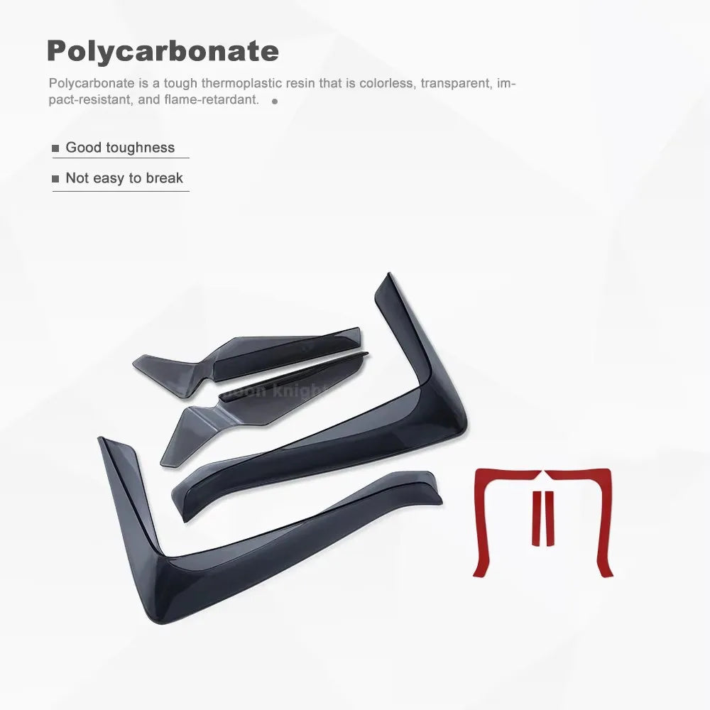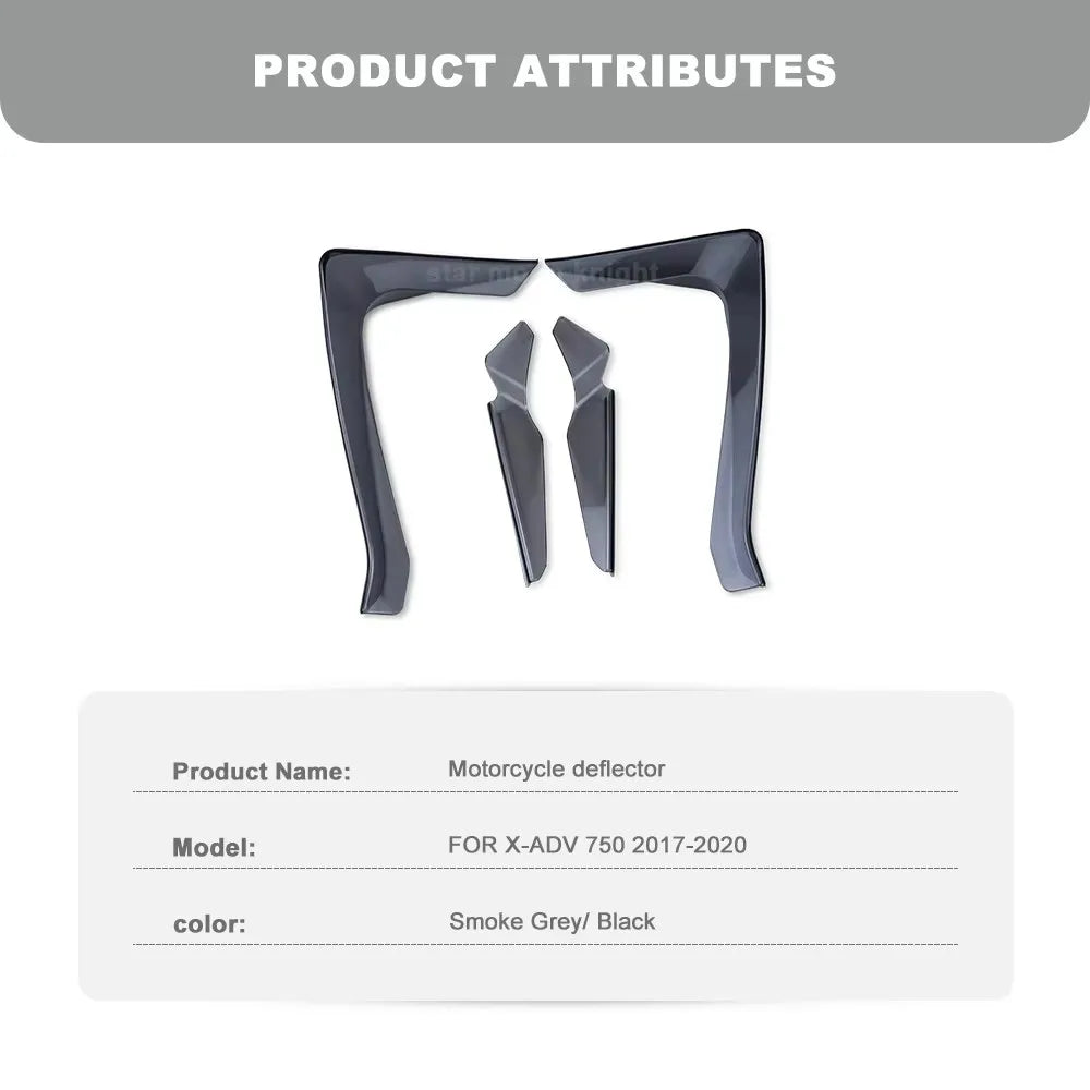 Enhance your Honda X-ADV 750’s touring comfort with these aerodynamic polycarbonate leg deflectors. Specifically designed for the X-ADV 750 (2017–2020), these wind deflectors modify the airflow at the lower part of the bike to smooth wind grip and reduce wind pressure on the rider’s waist and legs. The result is a more relaxed ride on long journeys, with feet staying warmer and drier in cool or rainy conditions. Crafted from durable polycarbonate and finished in Glossy Black or Smoke Gray, they blend protection and style while helping you stay comfortable mile after mile. This pair includes both left and right deflectors and fixing tape for a straightforward installation. Brand is Star Moon Knight, Model X-ADV 750, Origin: Mainland China.