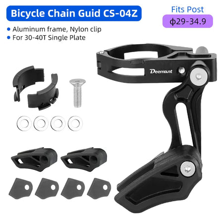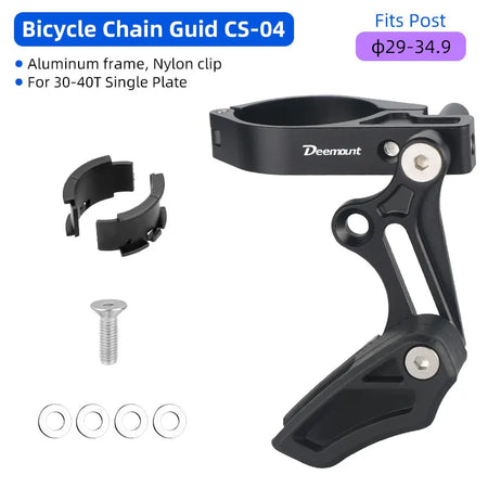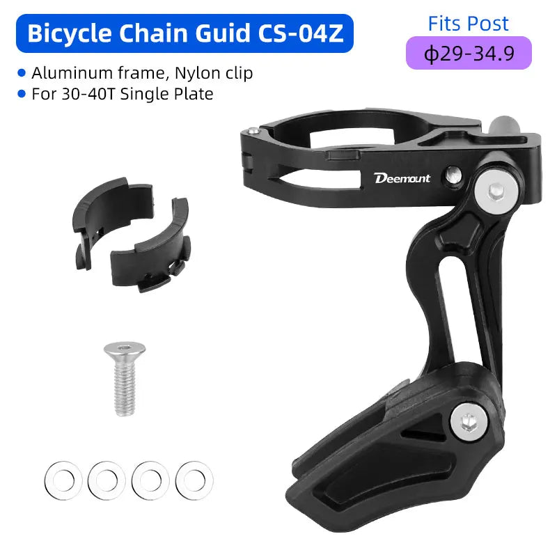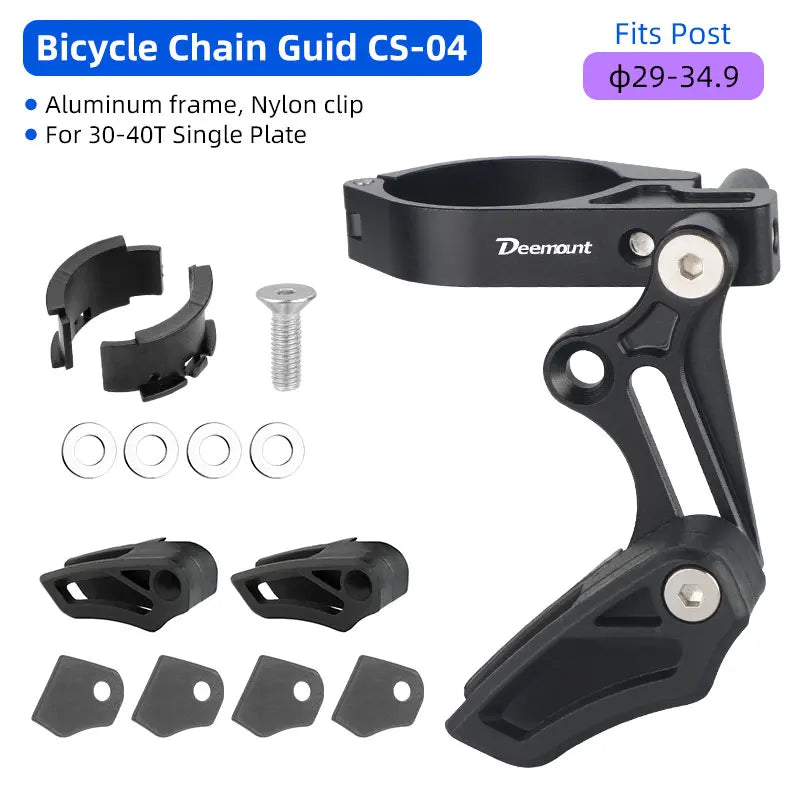 Introducing the Deemount 1X Chain Guide Anti Drop Aluminum Alloy Bracket (Model CS-004) — a purpose-built solution for MTB riders who demand reliable chain retention on a 1X drivetrain. Crafted from 7075 aluminum and CNC machined for a precise fit, this ultralight bracket keeps your chain in place even over rough terrain. It features liners to adapt the diameter range, a nylon chain holder for smooth operation, and a sturdy mount that attaches securely to your bike frame. Compatible with frames sized 27.2 to 34.9 mm, it adds minimal weight (about 55 g) to your setup while delivering maximum confidence on climbs and descents. Origin: Mainland China.