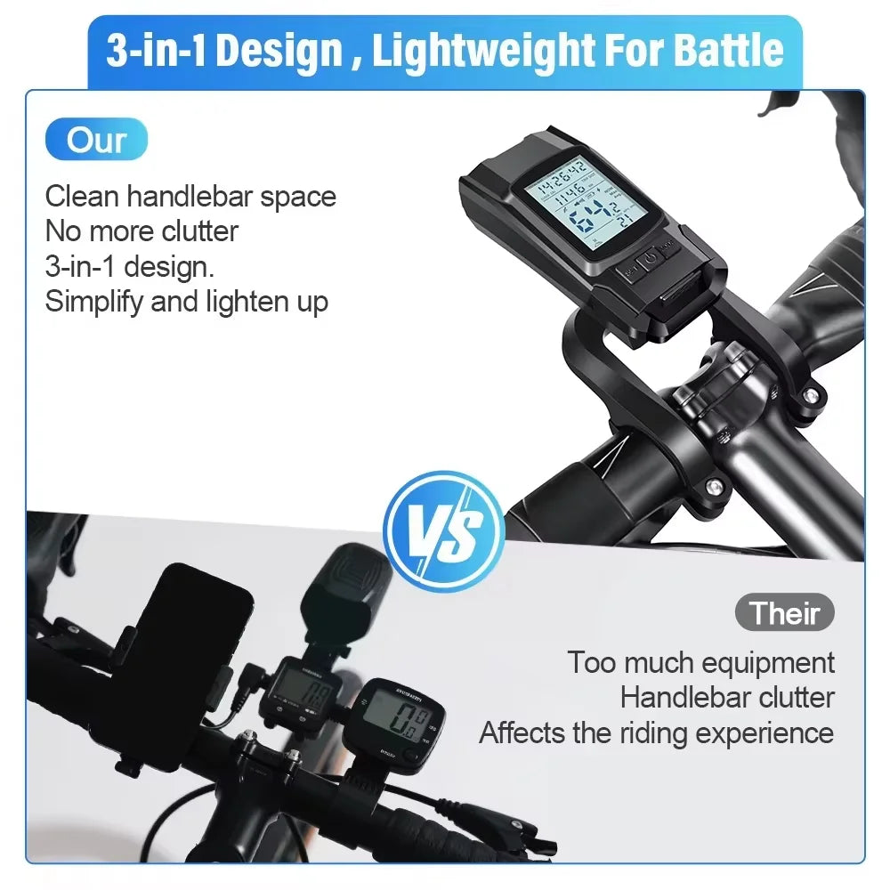 NewBoler LIG001 Bike Headlight GPS Speedometer Horn, 3 In 1 Front Lamp, Rechargeable ABS Waterproof