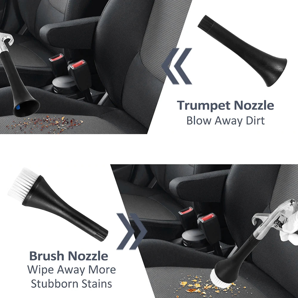 - Versatile cleaning — trumpet nozzle blasts away dirt and debris; brush nozzle facilitates scrubbing stubborn stains and pet hair from your car’s interior.