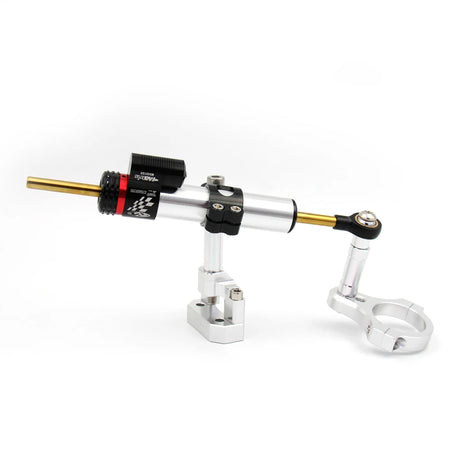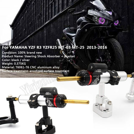 Upgrade your Yamaha YZF-R3, YZFR25, MT-03, or MT-25 with this CNC aluminum adjustable steering stabilizer damper bracket kit. Designed for 2013-2016 models, this kit delivers a rugged, lightweight solution to improve stability and reduce rider fatigue on uneven roads and during aggressive cornering. The kit includes a PC Damper and a bracket set, built to work seamlessly with Yamaha motorcycles and ensure a secure mounting point for the steering damper.