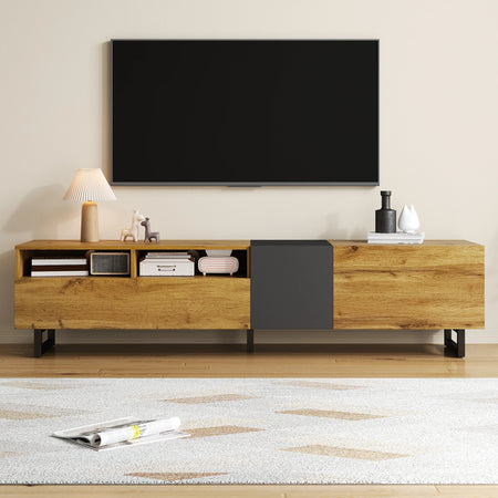 Experience organized style with the Colorblock TV Cabinet Three Doors And Two Compartments. This modern entertainment centerpiece combines natural wood tones with a gray-black finish and sturdy wrought iron legs, delivering a refined focal point for your living space. Not only beautiful, it also provides practical storage with three doors (including a drop-down door) and two open compartments, making it easy to keep media gear, remotes, and decor neatly arranged.