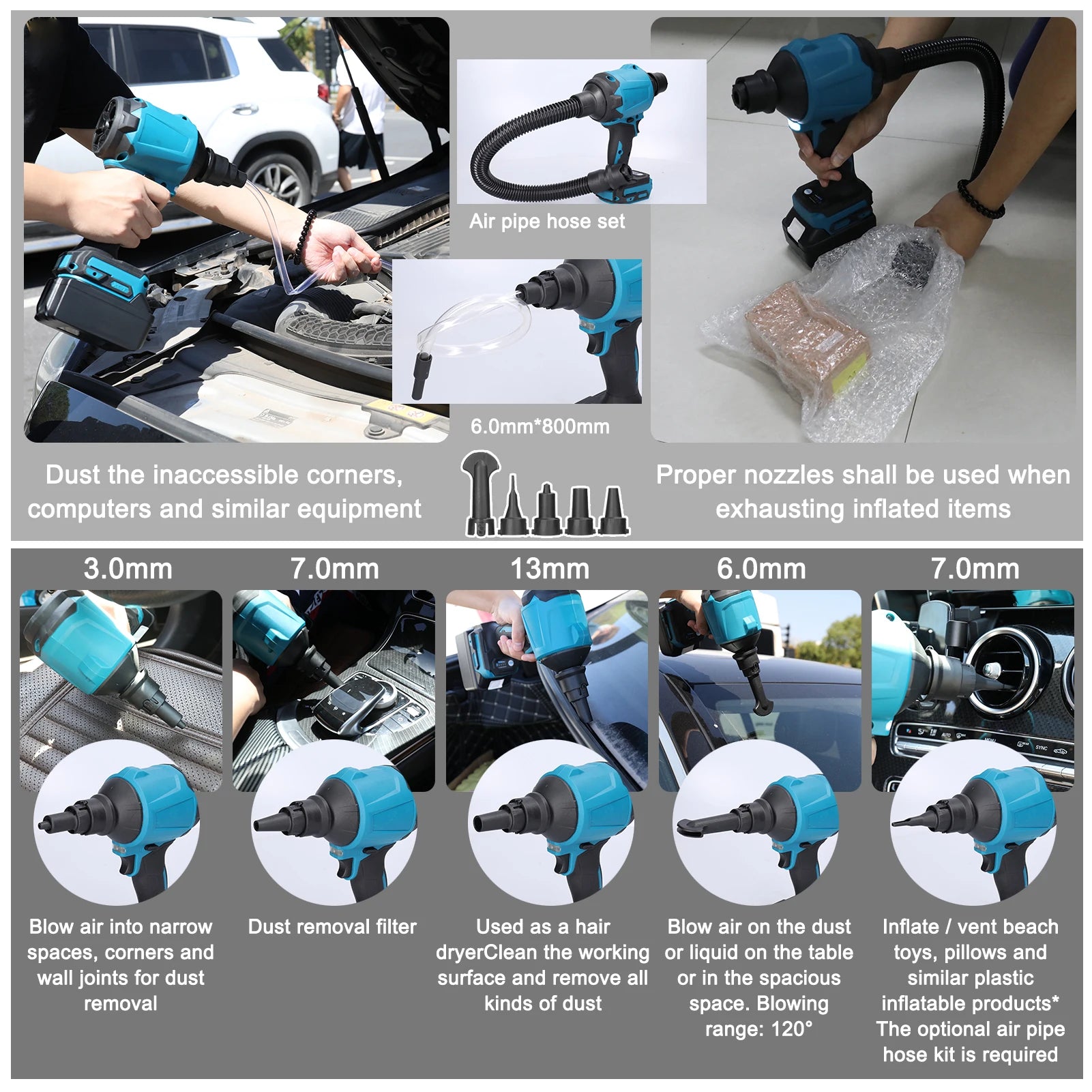 The Cordless Air Dust Blower 18V for Makita Battery Stepless is a versatile, high-performance tool designed to blast away dust and debris with ease. Built around a sturdy brush motor with a pure copper core, it delivers powerful suction and wind speeds up to 200 m/s, helping you tackle stubborn particles in workshops, renovation spaces, and tight corners. With a maximum air pressure of 29.7 kPa and a sealing suction pressure up to 10.3 kPa (using the sealing hose), this blower makes quick work of clearing pilot holes, tool chucks, and dusty surfaces. The stepless speed-change design lets you control airflow simply by how hard you press the trigger, while four output modes let you tailor the wind to the task at hand. An ergonomic, anti-slip handle reduces fatigue, and the built-in LED light illuminates dark work areas for safer, more precise cleaning. It’s compatible with Makita 18V batteries (not included), offering cordless convenience for on-site cleaning and maintenance. With a quick-change nozzle system and a complete nozzle kit (7 nozzles and 2 air hoses), you’re ready for a wide range of applications, from workshop cleanup to inflating pool toys and dust removal from holes.