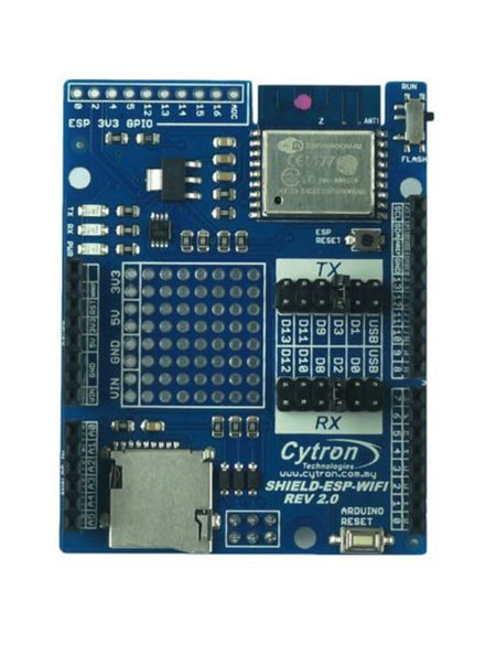 The Cytron ESP8266 WiFi Shield is the perfect solution for Arduino users looking to seamlessly integrate WiFi connectivity into their projects. With its user-friendly design and pre-flashed AT-command firmware, this shield simplifies the process of controlling and accessing the ESP8266's I/O. Whether you're a beginner or an experienced maker, this shield offers versatility and convenience. Take advantage of the microSD card option for efficient data storage and logging. Get your projects connected with ease using the Cytron ESP8266 WiFi Shield!