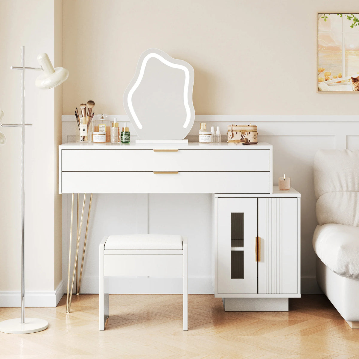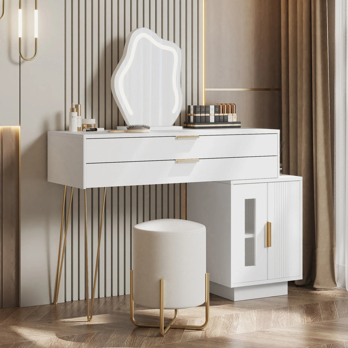 Designed for modern bedrooms and dressing spaces, this vanity blends practical storage with flexible lighting. Two large drawers keep eyeshadow, blush, lipstick, and other cosmetics neatly organized and within easy reach, while the 3-color LED makeup mirror offers adjustable lighting and a responsive touchscreen control for flawless makeup results in any setting. The extendable design lets you position the table and side cabinet left or right to fit your room layout precisely, delivering a comfortable, customized makeup experience.