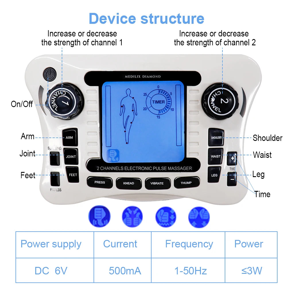 Built with practical, user-friendly operation in mind, the device features an auto-stop after 30 minutes and a 5-second self-check function that cuts power if electrode pads are removed. The dual-channel capability, intuitive controls, and clear mode prompts make routine massage therapy quick, comfortable and effective.
