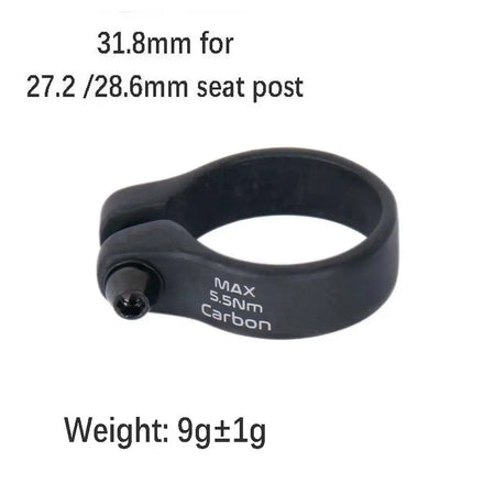 Two size options ensure compatibility with a range of seat posts: 31.8mm for 27.2–28.6mm posts and 34.9mm for 30.4–31.6mm posts. The clamp is secured with a titanium screw for reliable, corrosion-resistant installation, and it weighs only 9g±1g (31.8mm) or 10g±1g (34.9mm). The torque spec is 5.5Nm, providing a secure hold without risking damage to your frame.