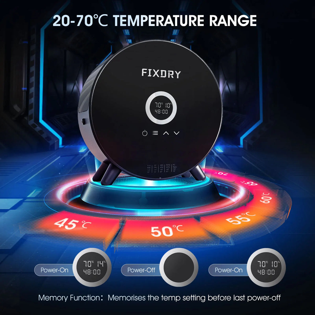 360° all-round heating delivers uniform drying. The energy-saving PTC heater works with an integrated high-performance fan to dehumidify filaments quickly and evenly. The bottom-mounted heater can reach up to 70°C, ensuring thorough drying while minimizing temperature extremes inside the box.
