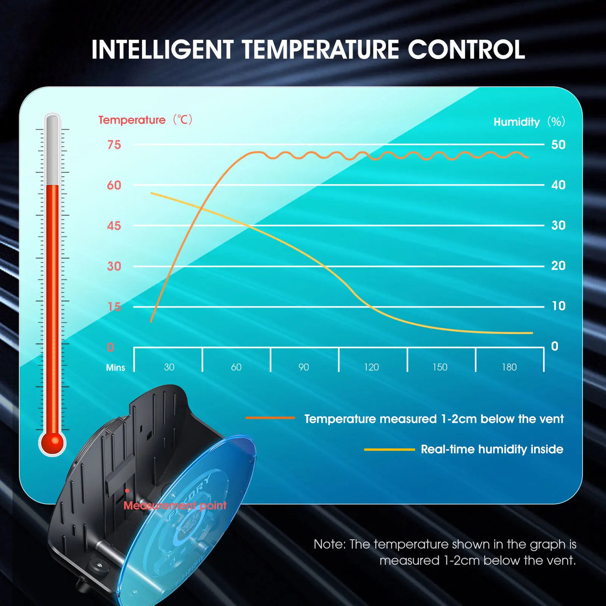 Easy temperature control enables precise settings from 45 to 70°C via a simple knob. The device provides recommended parameters for various filaments. Remember to follow the suggested temperature and time; improper settings can cause filament deformation. A high-precision sensor continuously monitors moisture, with a digital display showing humidity from 10% to 99% for easy assessment. After use, humidity can drop to around 10% or lower.
