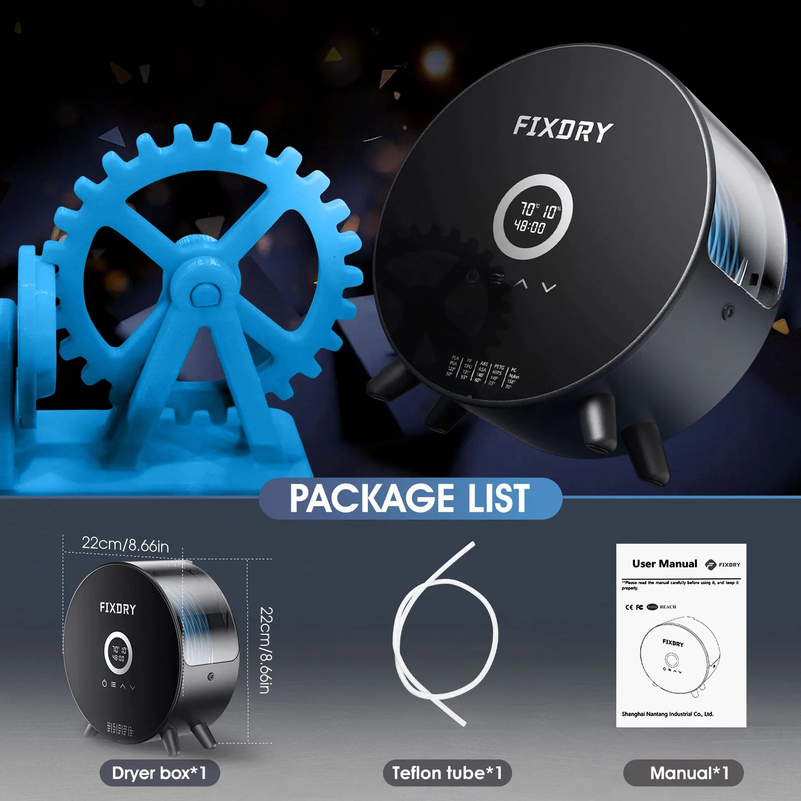 - Key features: 360° heating, real-time humidity & temperature detection, adjustable temperature & time, doubles as filament storage box