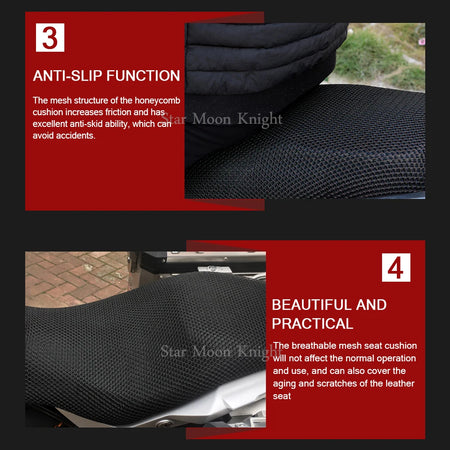 Introducing the Kawasaki Versys1000 ABS Rear Seat Cowl Cover With Waterproof Insulation 3D Mesh Protector by Star Moon Knight. This seat cover acts like air conditioning for your original motorcycle seat, delivering constant cooling and airflow as you ride. The three-dimensional mesh design keeps air circulating even when you’re seated, so you don’t feel trapped or sweaty on long journeys. It can’t be fully compressed under weight, which preserves ventilation and keeps you comfortable in varying conditions. The waterproof insulation layer helps keep your buttocks dry during rainy weather, while the cover stays cool under direct sunlight to prevent heat buildup. A massage-like effect from the cushioning provides relief from fatigue, making rides feel smoother. Quick to install with Velcro fasteners and elastic rubber bands, the cover is UV-resistant for durable color and performance, and easily washable for everyday use. It adds high seating comfort thanks to an additional layer of cushioning, and is designed specifically for Kawasaki Versys 1000 and Kawasaki Versys 1000 ABS models.