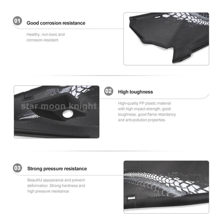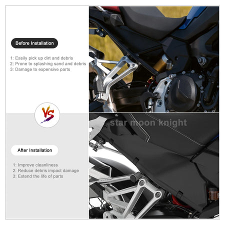 Enhance your BMW riding experience with the BMW F 900 GS Adventure Frame Side Fairing by Star Moon Knight. This decorative, weather-resistant cover is designed to neatly enclose the two rear frame openings, safeguarding you from dirt, stone strikes, splashback, and spray while maintaining a sleek, discreet look on the bike. Crafted for a clean, unobtrusive appearance, the fairing remains visually appealing even at a glance, and its simple assembly makes installation a breeze.
