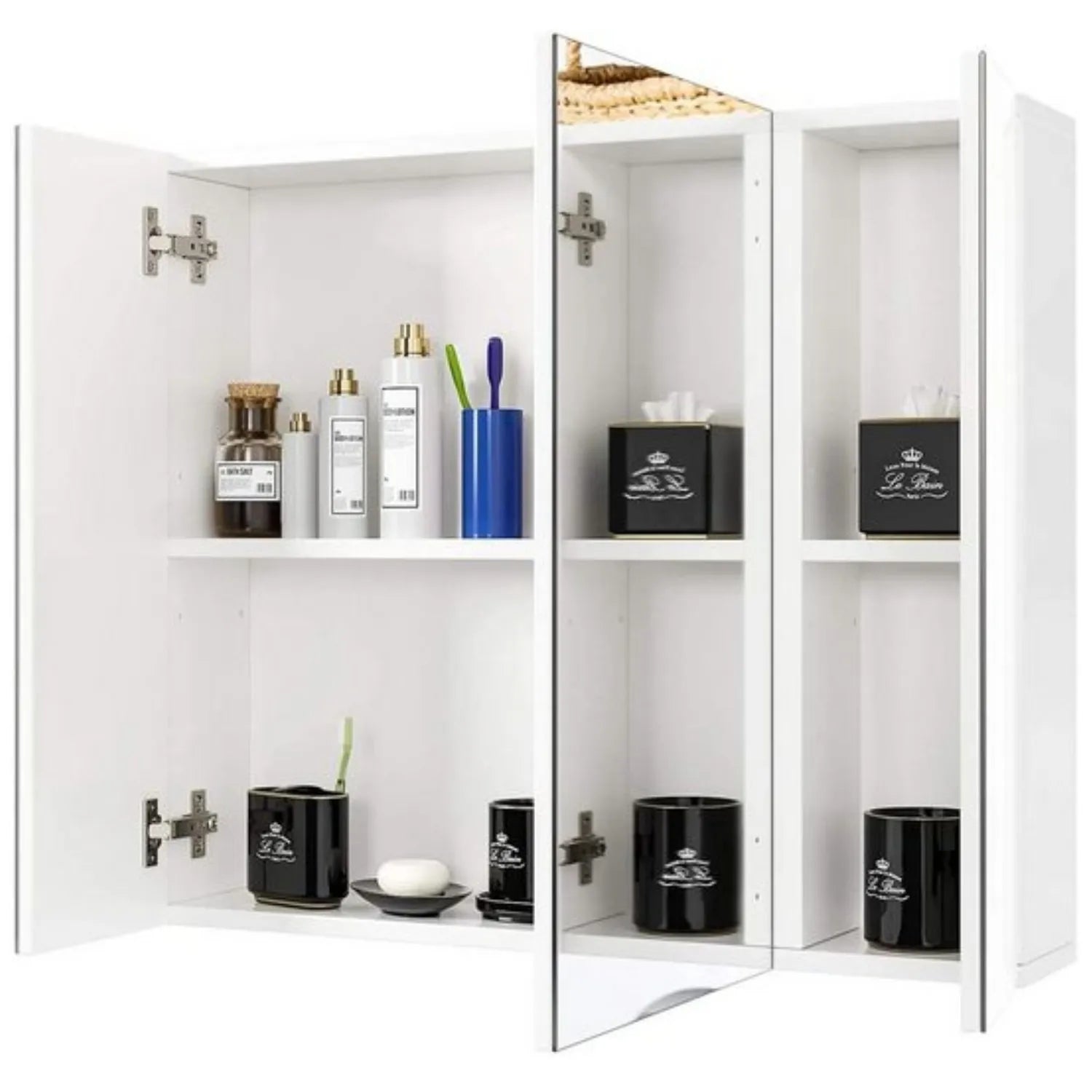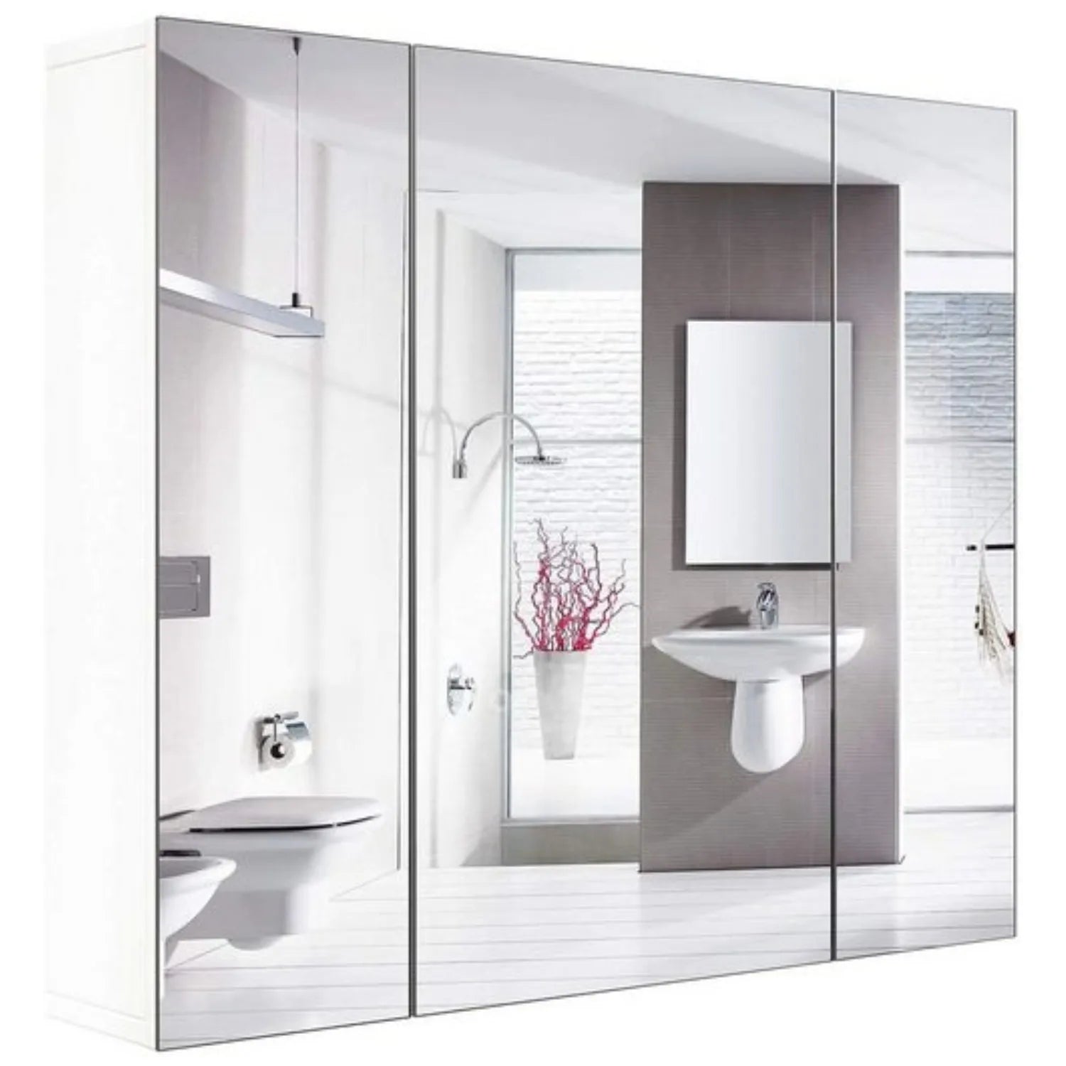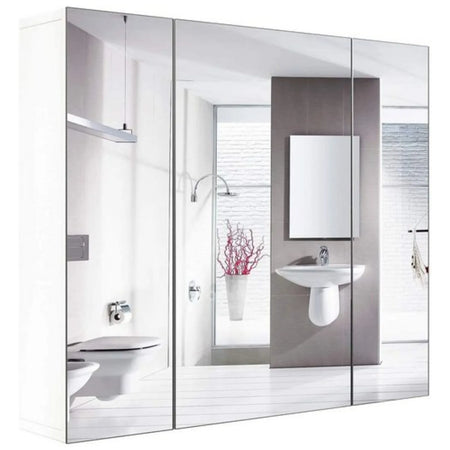 Three door, three storage layers: this moisture-proof wall-mounted mirror cabinet features three rimless doors and adjustable internal partitions with a 27.5 cm spacing, providing flexible organization for toiletries, towels, and everyday essentials.