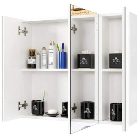 Premium build for humid environments: the cabinet is crafted from high-quality MDF panels with a moisture-proof spray-painted finish. The stainless steel hinges resist rust, ensuring lasting durability. The mirror cabinet is designed for wall mounting with an overall size of 70 × 15 × 60 cm. Side mirrors measure 17.3 × 60.3 cm each, and the middle mirror measures 34.5 × 60.3 cm, delivering a broad, uniform reflection for your bathroom.