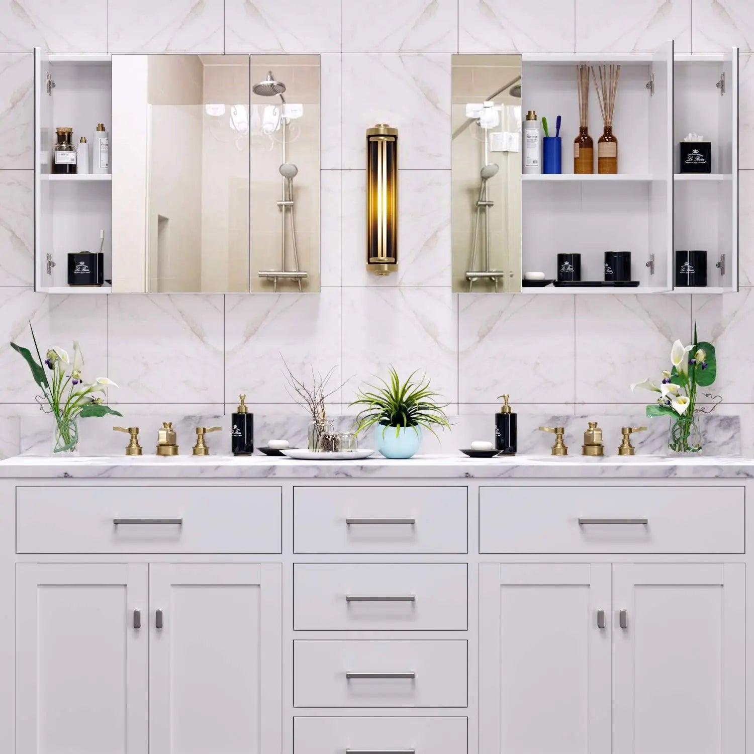 - Maximize bathroom space by storing items behind the mirrored doors, keeping countertops clear and easy to clean.