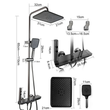 Upgrade your daily rinse with the Grey Shower Set Four-Function Smart Digital Display Shower System Rainfall Pressurized Wall-mounted Piano Key Shower Faucet Set. This grey, square-shape shower system blends modern aesthetics with reliable performance. It pairs a rainfall overhead shower with a pressurized hand shower for a versatile, spa-like experience in the comfort of your own home. The body is crafted from stainless steel with a chrome-plated finish for durability and a sleek look that resists corrosion and wipes clean easily. Note that the shower head is ABS plastic. The system features a digital display for status readouts (not a smart device) and requires a minimum water pressure of 0.2 MPa for the display to operate properly. The hot water pipe is on the left side and the cold water pipe on the right side for easy installation and intuitive use.