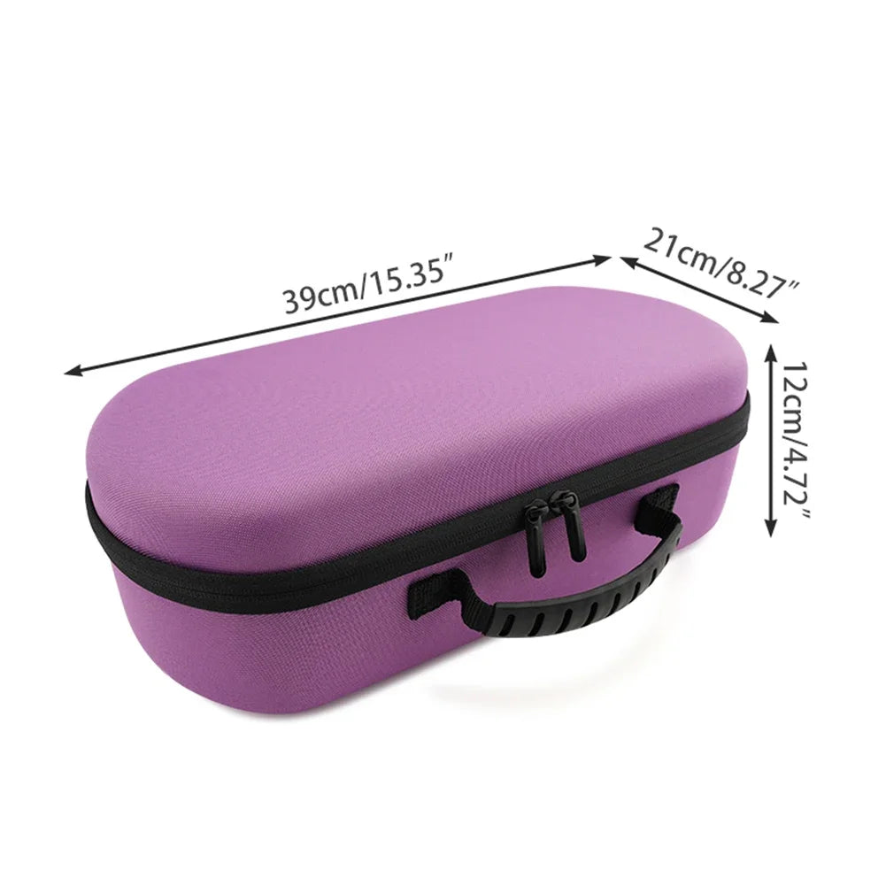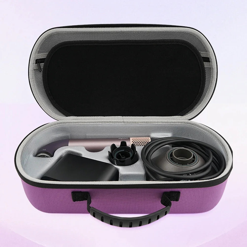 Protect your Dyson Supersonic HD17/HD18 with a purpose-built hard carrying case that keeps your dryer secure on the go and at home. The contoured interior is tailored to fit the unit precisely, while the durable Oxford cloth exterior and EVA hard shell deliver shockproof, scratch-proof protection against bumps, drops, and dust. Precise grooves hold the components in place, so you never have to worry about tangled cords or loose attachments during transport. Dual zippers make access quick, and the ergonomic handle provides a comfortable grip for travel or storage. Note: this listing includes one storage bag only; the Dyson Supersonic dryer and accessories are not included. Available in black and purple, with weights of 695g (black) and 734g (purple). Case size is 390 × 210 × 120 mm (15.35 × 8.27 × 4.72 inches).