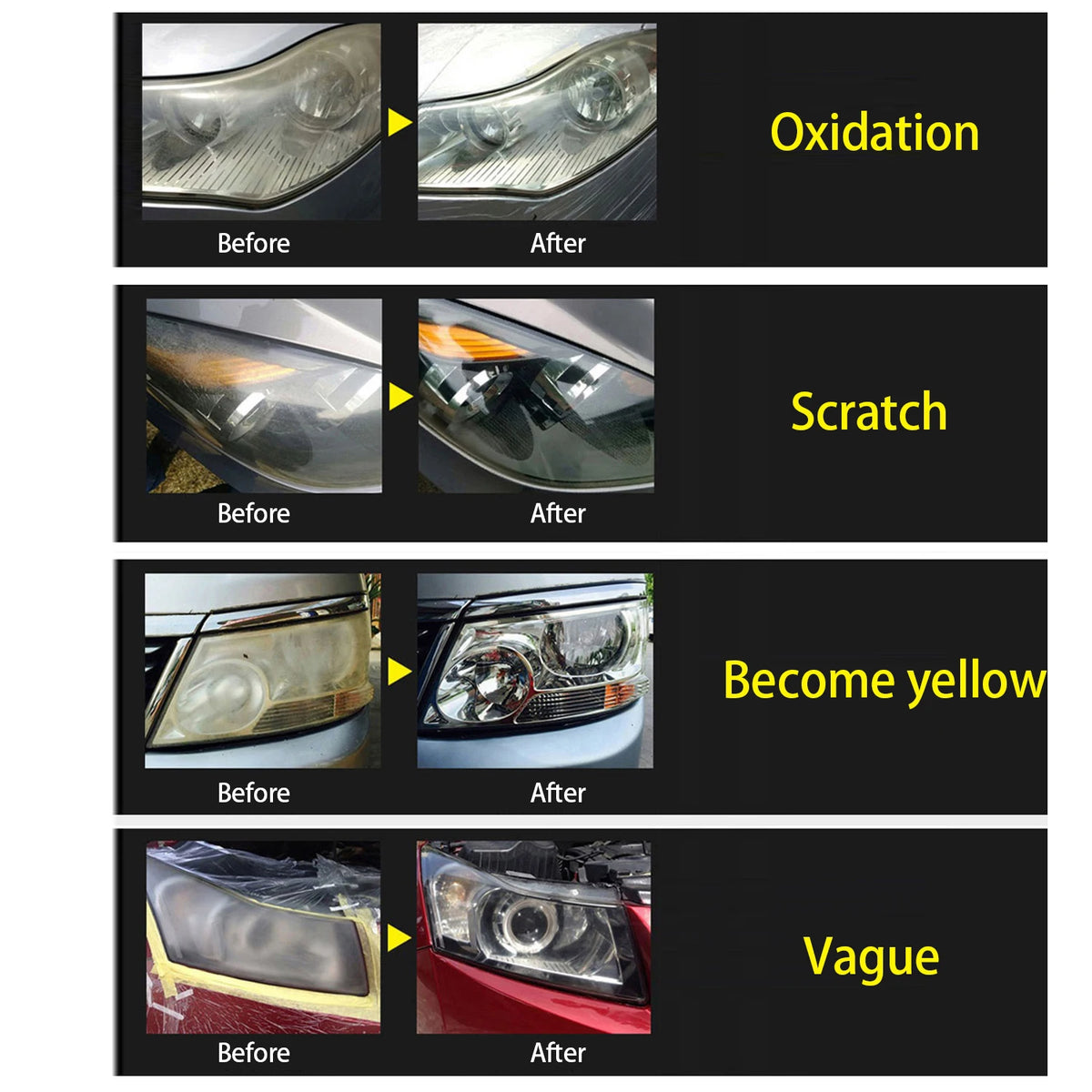 - Restore headlight clarity and improve night visibility by eliminating scratches, yellowing, blur, and oxidation.
