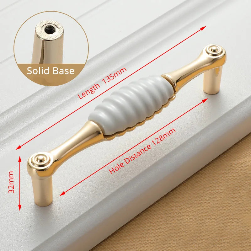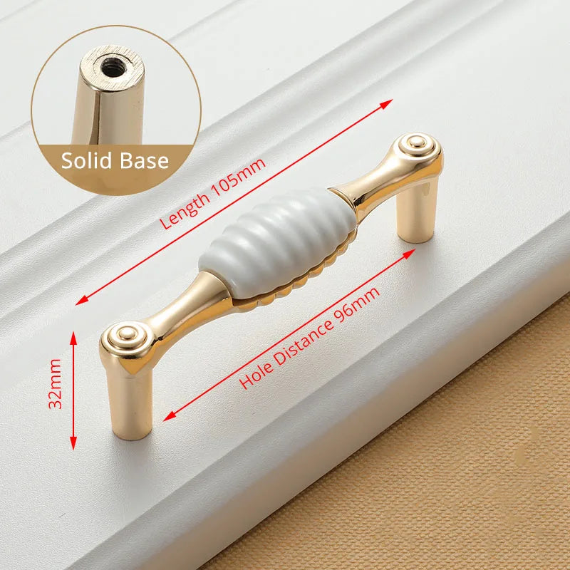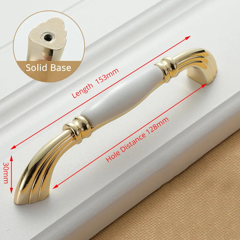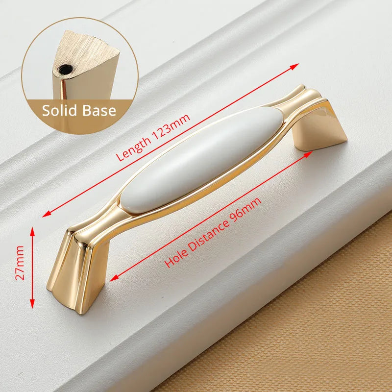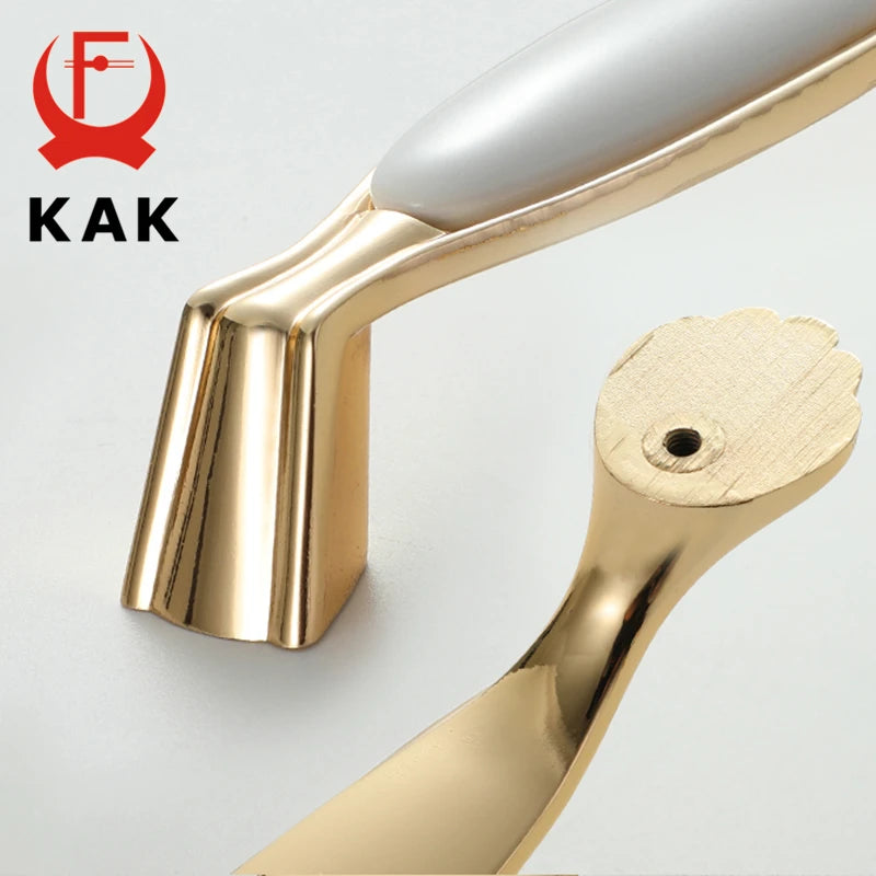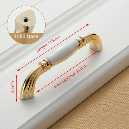 KAK White Ceramic Gold Cabinet Knobs and Drawer Pulls are premium ceramic and zinc alloy hardware designed to elevate kitchen cabinets, drawers, and cupboard doors with a timeless European style. Featuring a gold finish over white ceramic, these handles bring a clean, luxe look while improving grip and ease of use. Compatible with single-hole installation across 96mm or 128mm hole spacings, they are a quick and durable update for any cabinetry. Made by 100% Brand KAK, these pulls are built to last and resist fading, making them ideal for high-traffic kitchens, bathrooms, and kid-friendly spaces. Model Number: Handle-1095GW. Origin: Mainland China.