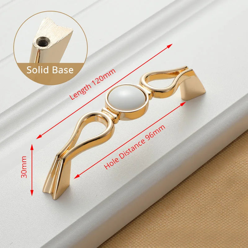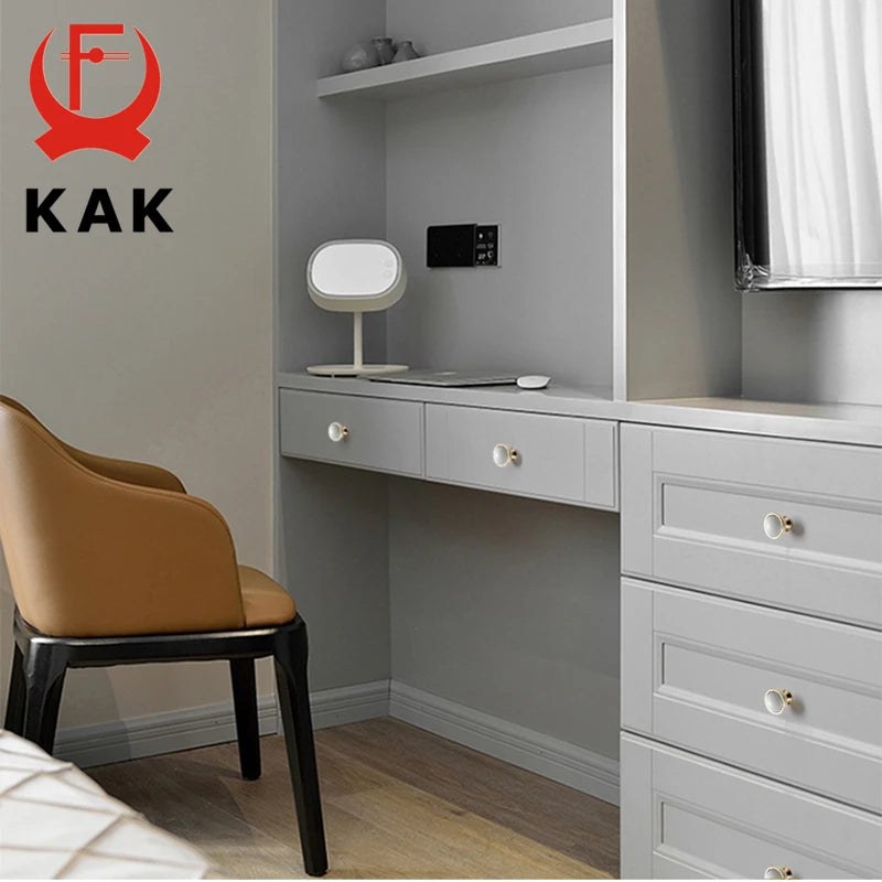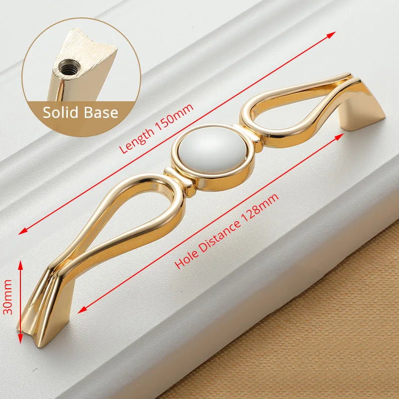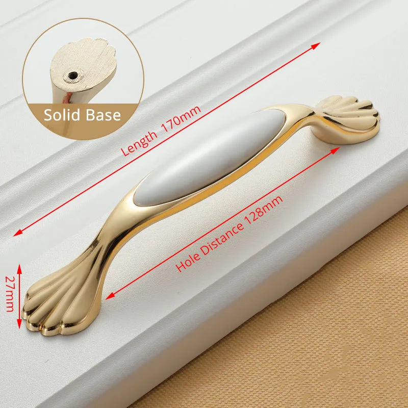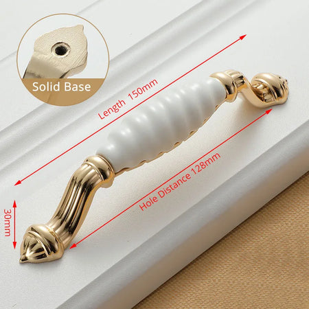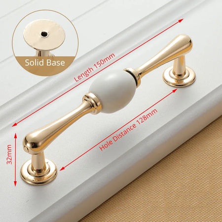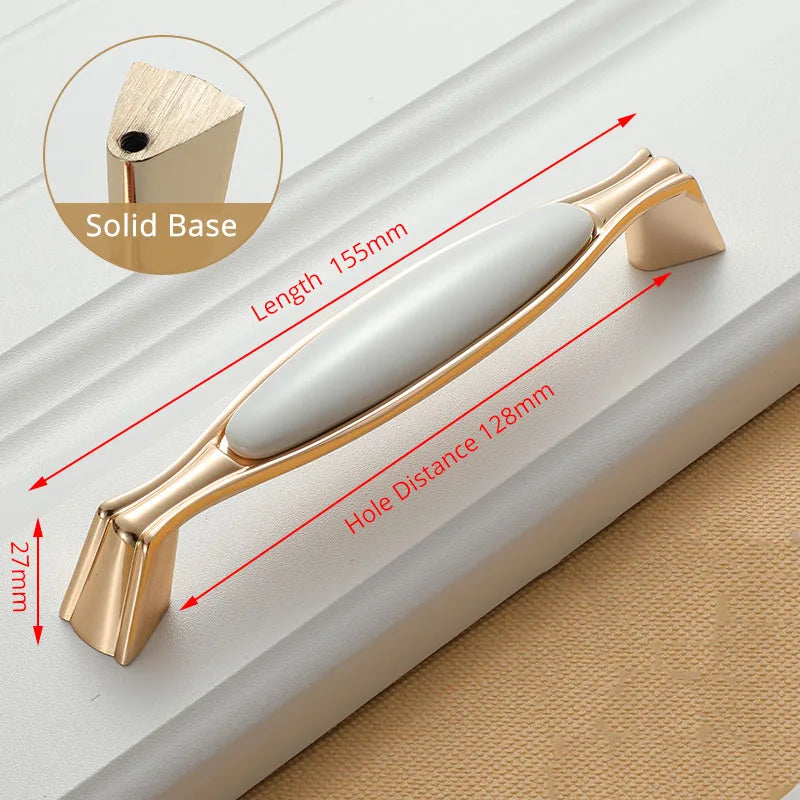 KAK White Ceramic Gold Cabinet Knobs and Drawer Pulls are premium ceramic and zinc alloy hardware designed to elevate kitchen cabinets, drawers, and cupboard doors with a timeless European style. Featuring a gold finish over white ceramic, these handles bring a clean, luxe look while improving grip and ease of use. Compatible with single-hole installation across 96mm or 128mm hole spacings, they are a quick and durable update for any cabinetry. Made by 100% Brand KAK, these pulls are built to last and resist fading, making them ideal for high-traffic kitchens, bathrooms, and kid-friendly spaces. Model Number: Handle-1095GW. Origin: Mainland China.