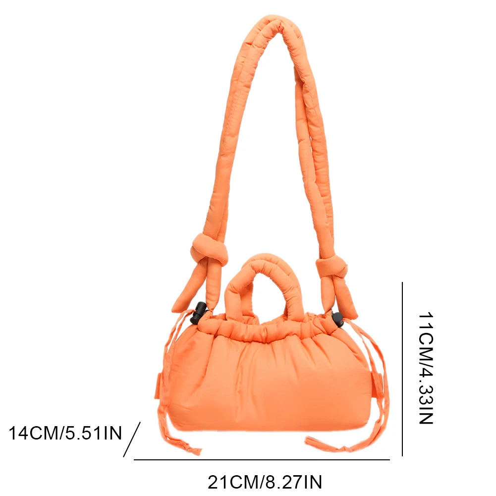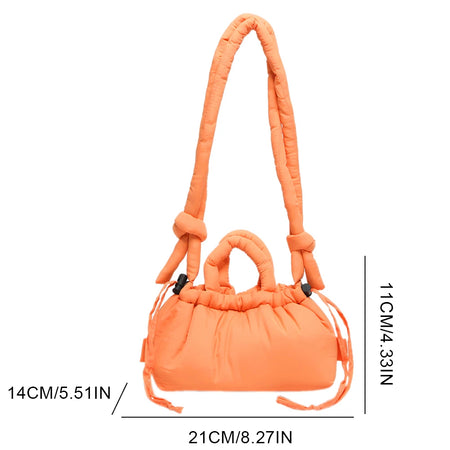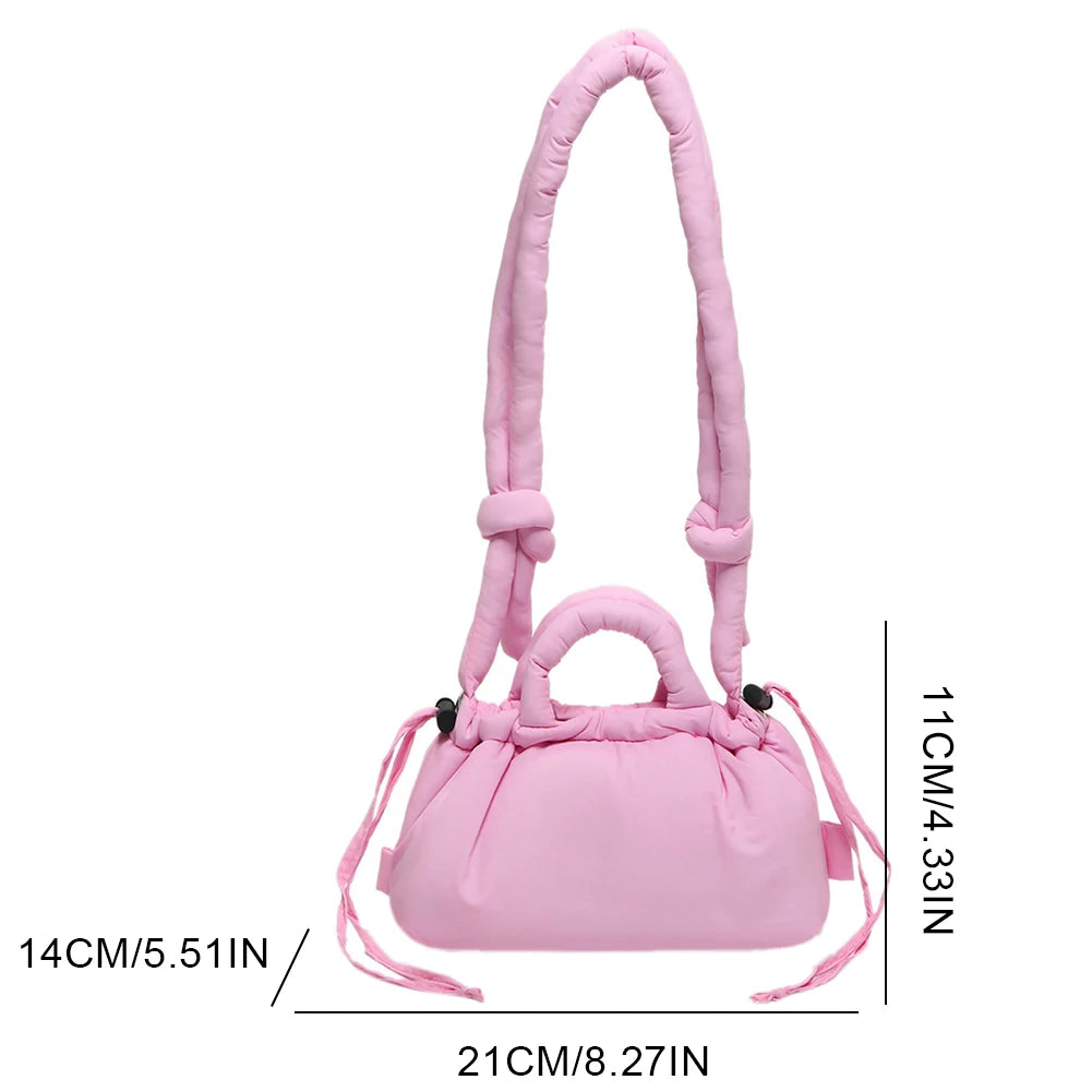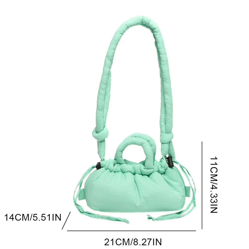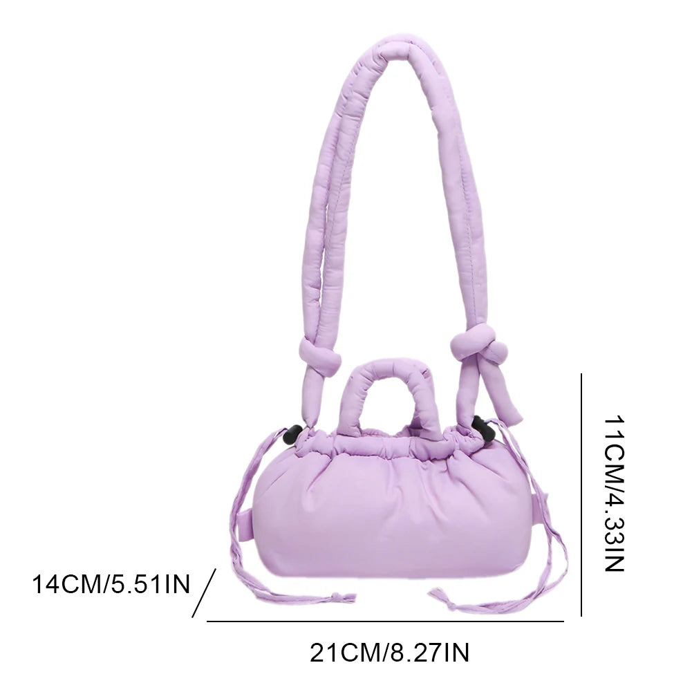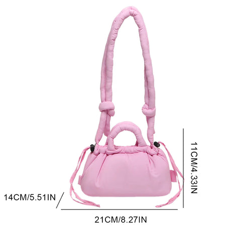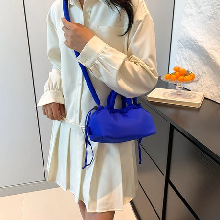 Meet the Korean Candy Color Soft Dacron Shoulder Bag Crossbody — a chic, compact companion crafted from durable polyester with a cotton padded top handle. This versatile bag blends fashion and practicality, making everyday outings feel effortless. Its Candy Color finish adds a playful touch to any outfit, while the ruched exterior detail gives a modern, fashionable silhouette.