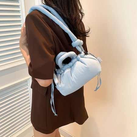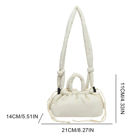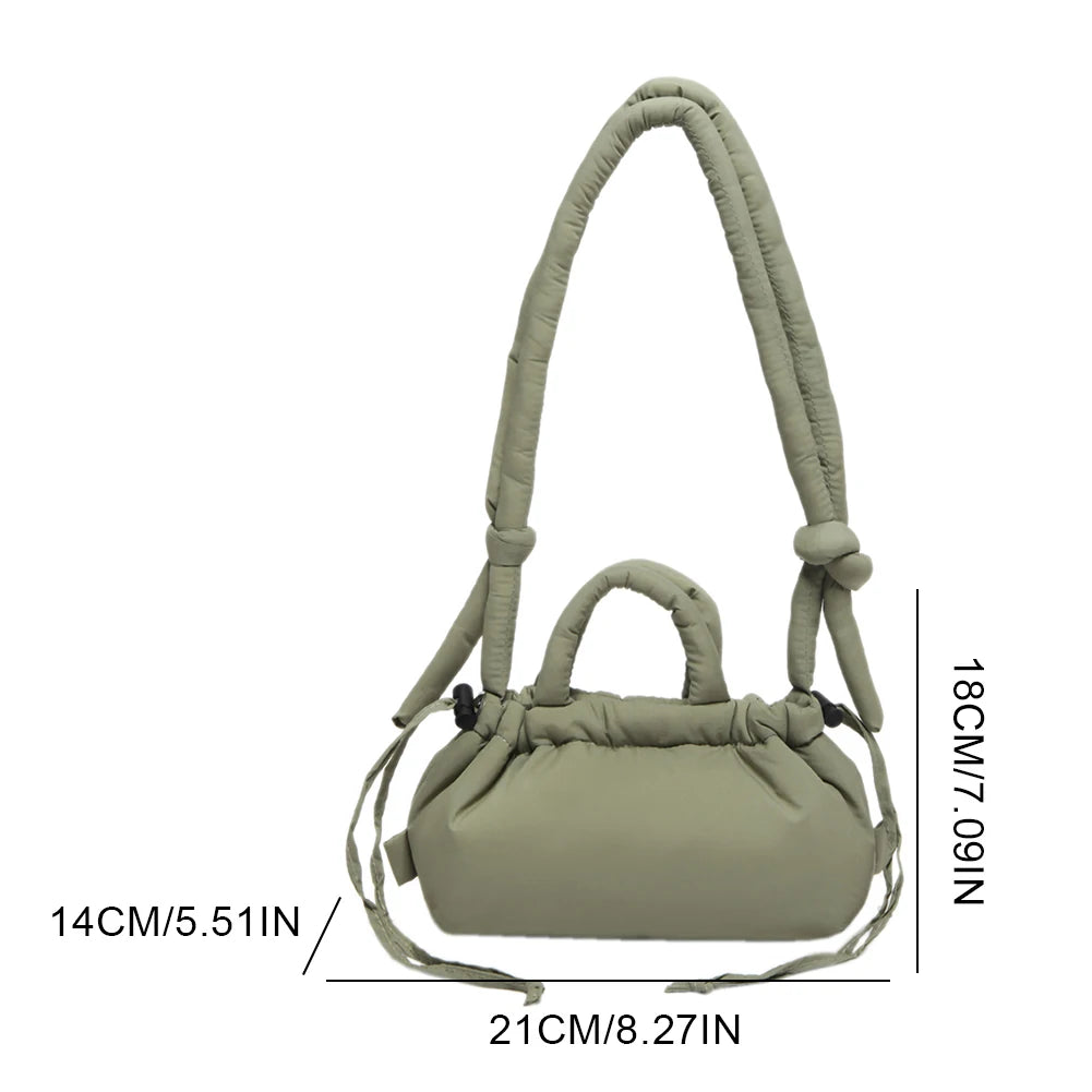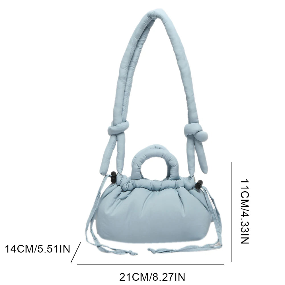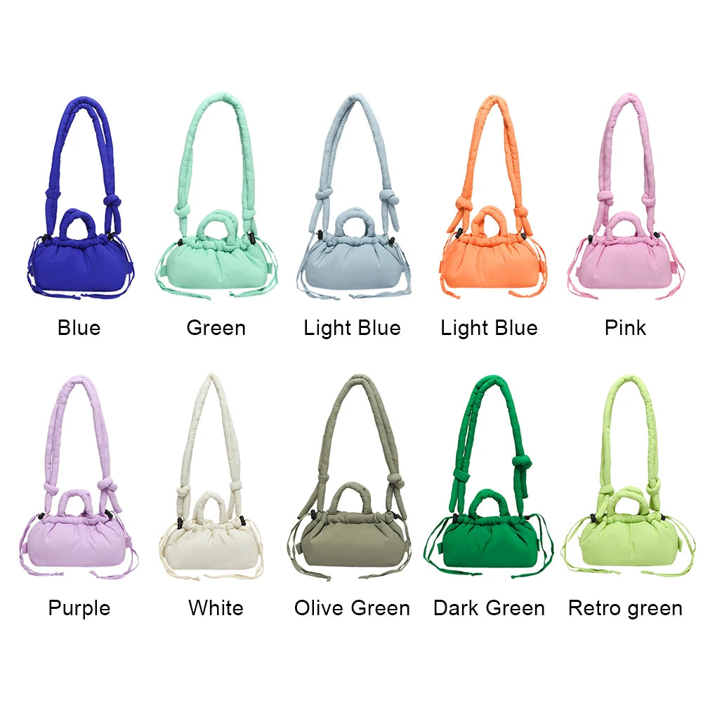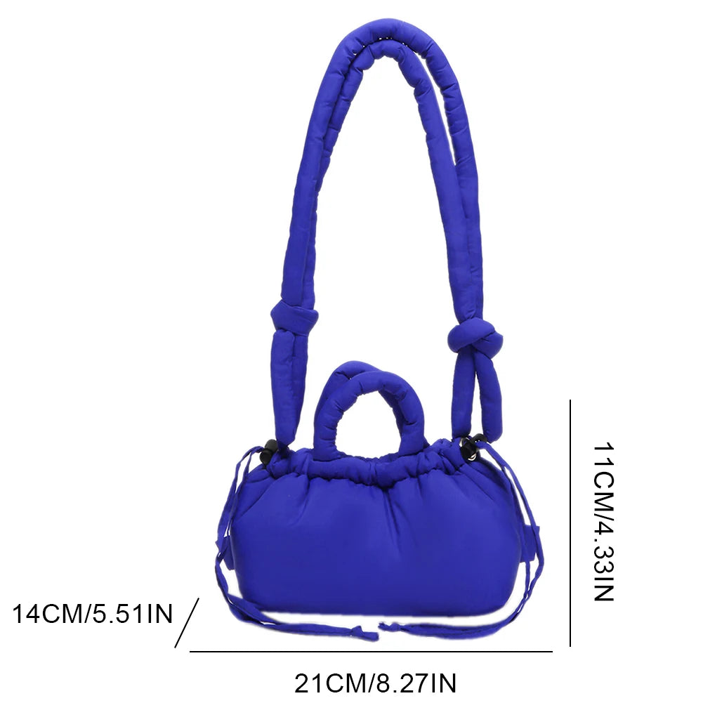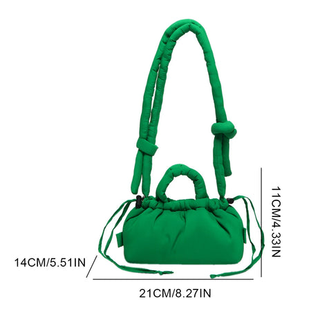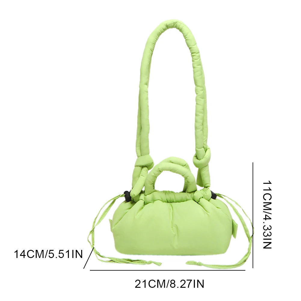 Meet the Korean Candy Color Soft Dacron Shoulder Bag Crossbody — a chic, compact companion crafted from durable polyester with a cotton padded top handle. This versatile bag blends fashion and practicality, making everyday outings feel effortless. Its Candy Color finish adds a playful touch to any outfit, while the ruched exterior detail gives a modern, fashionable silhouette.