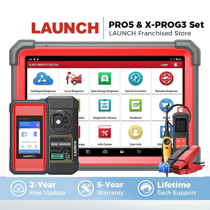 Introducing the Launch X431 PRO5 with X-PROG3 IMMO Scanner Tool Set, the latest all-in-one high-end professional car diagnostic solution built for serious workshops and enthusiasts. Loaded with 2024 hardware and software, it delivers OE-level diagnostics across 100+ brands and 20,000+ models, empowering you to diagnose, code, and program with confidence.