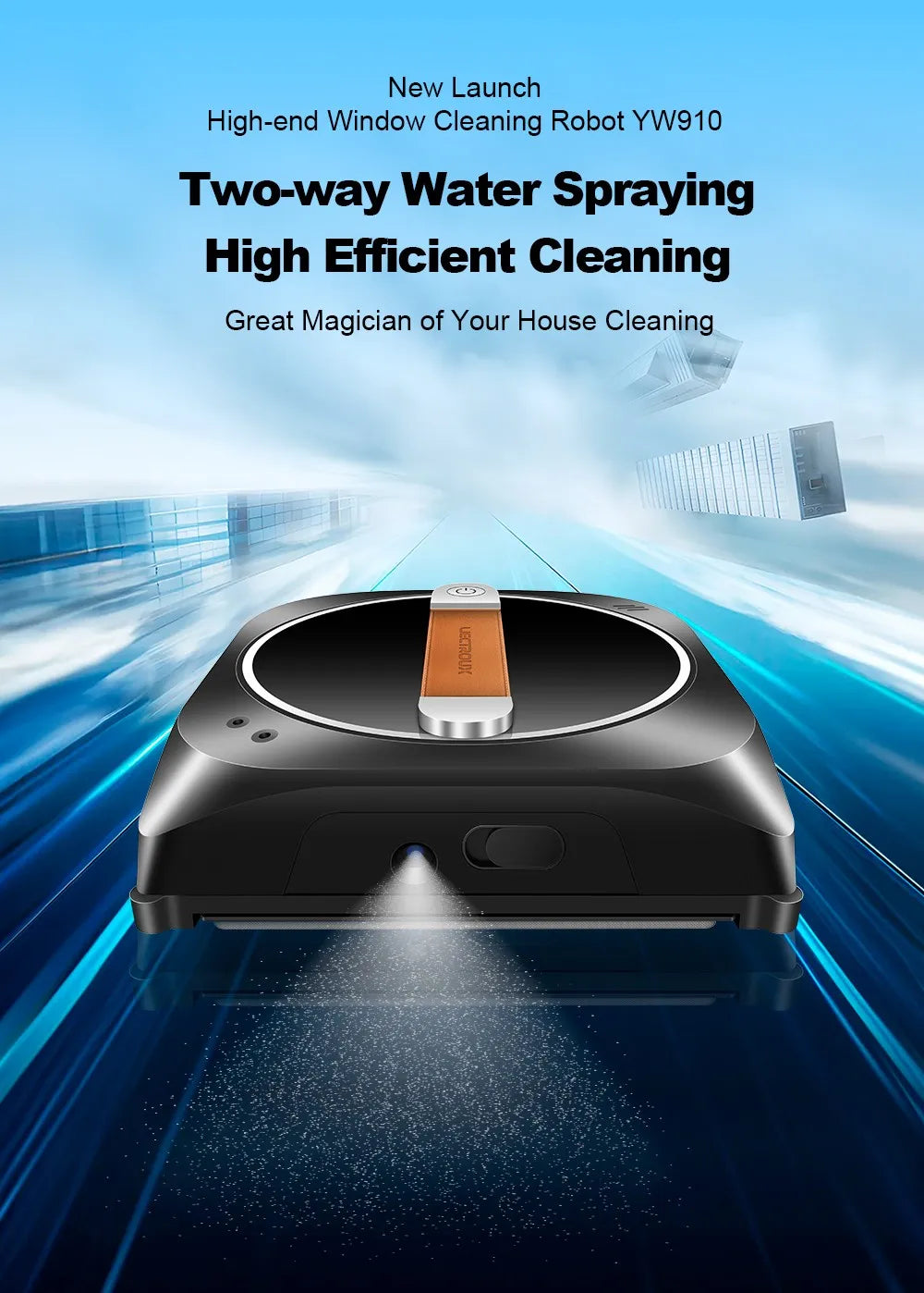 Control is effortless: use the mobile app or the included remote for convenient operation. The device communicates over a 2.4G wireless network with strong signal penetration and a practical operating range of up to 15 meters, so you can manage cleaning from across the room or even from another part of the house. A powerful 3000Pa vacuum suction provides a secure grip on glass, while a rugged track design increases friction to prevent slipping on wet surfaces for a stable, reliable cleaning route. The YW910 runs quietly at around 65dB, letting you clean without loud disruption. A water spraying system supports both manual and automatic modes, delivering a double water spray for effective streak-free results.