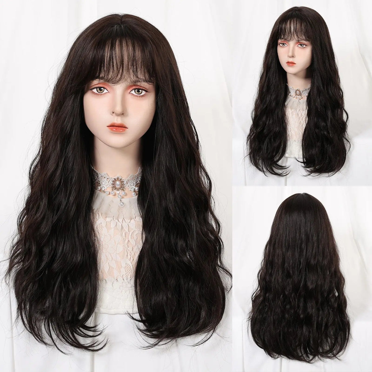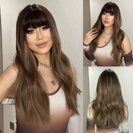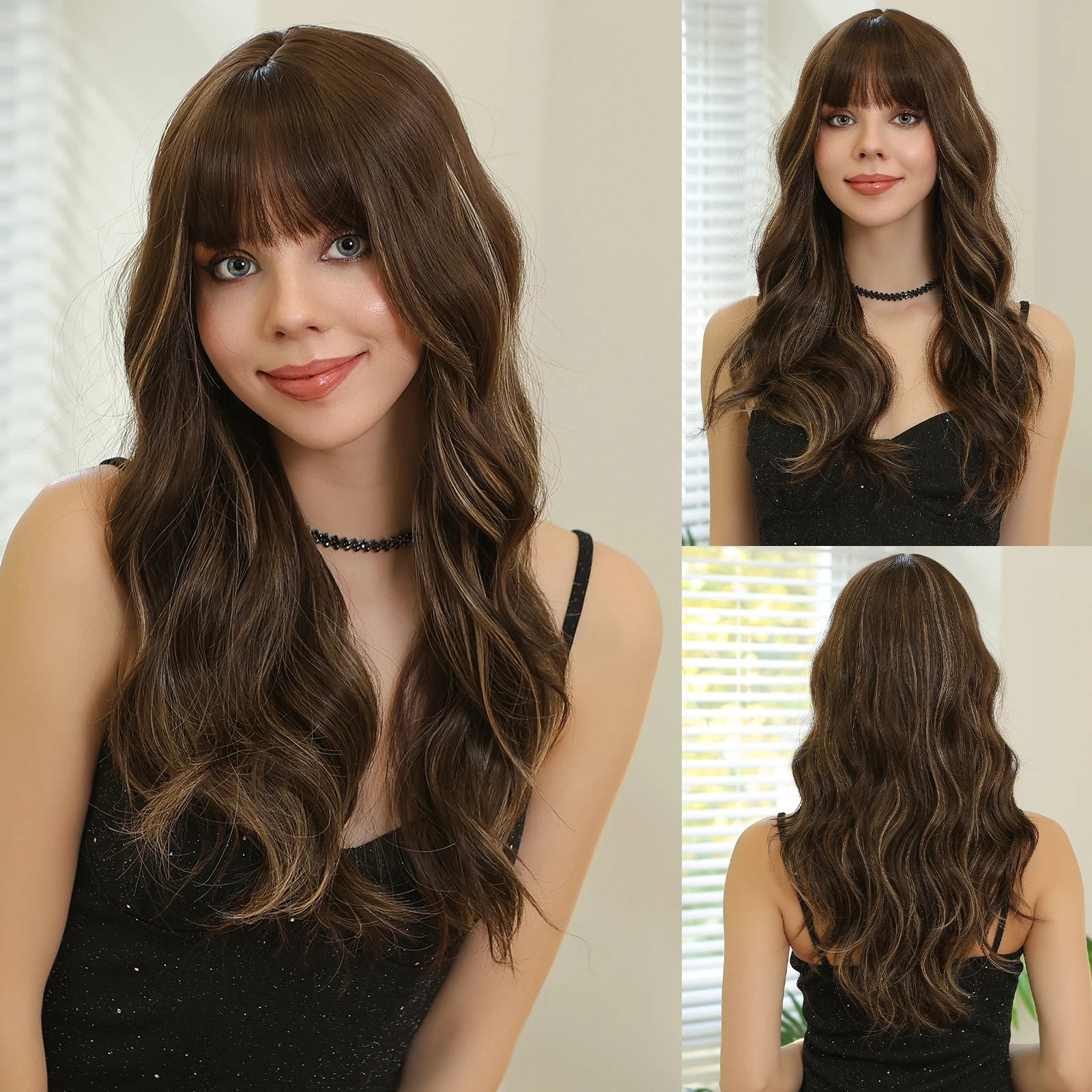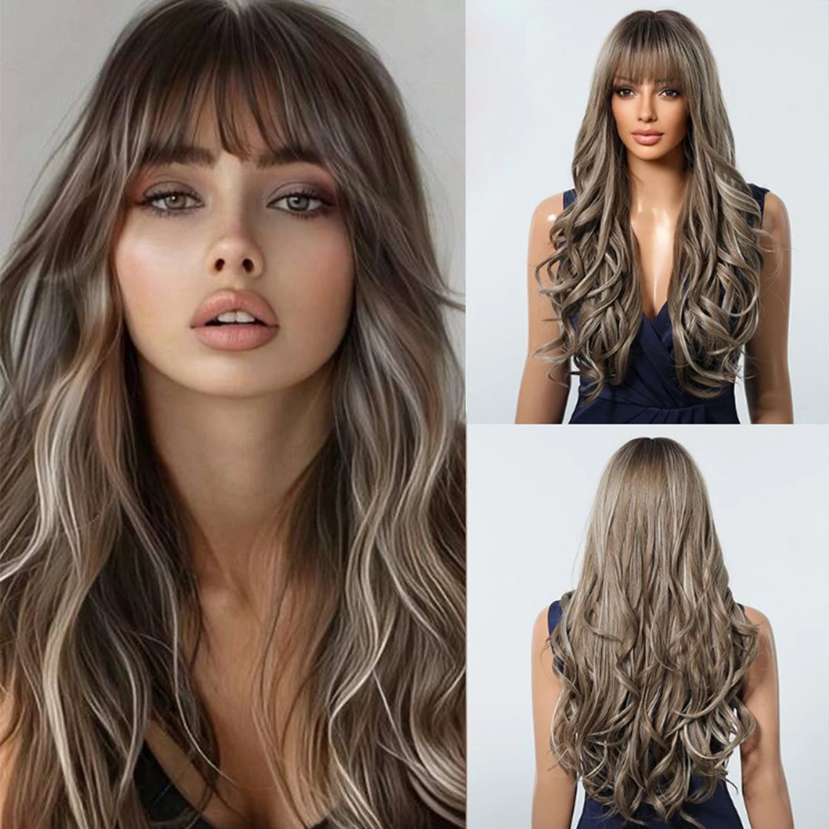 Long Wavy Layered Synthetic Wig with Brown Highlights and Side Bangs