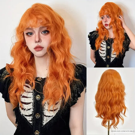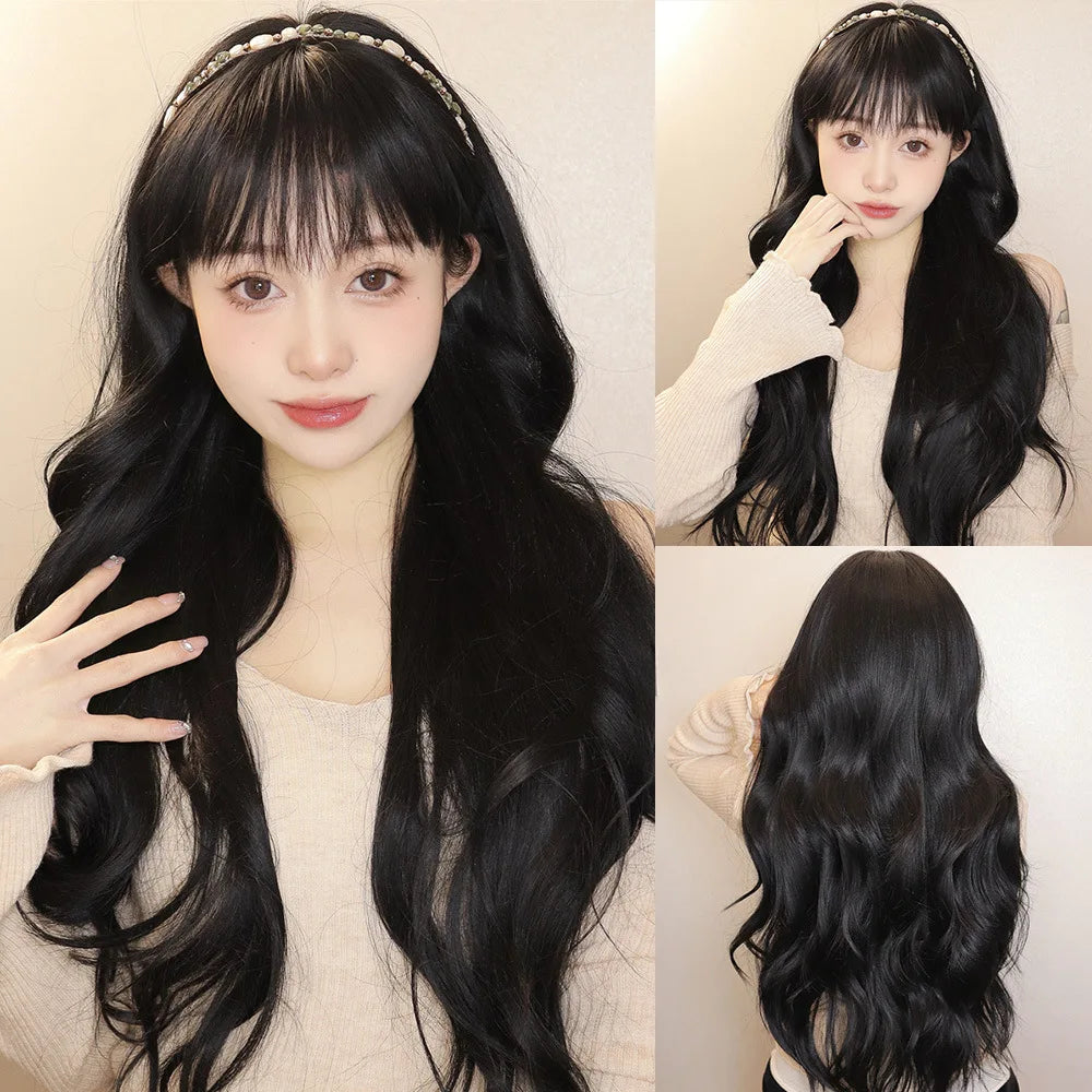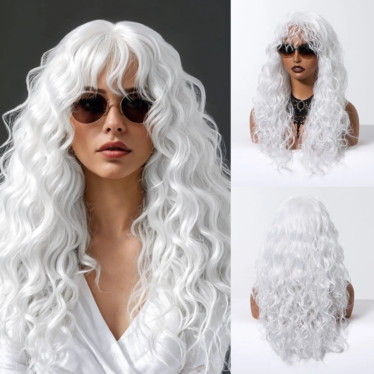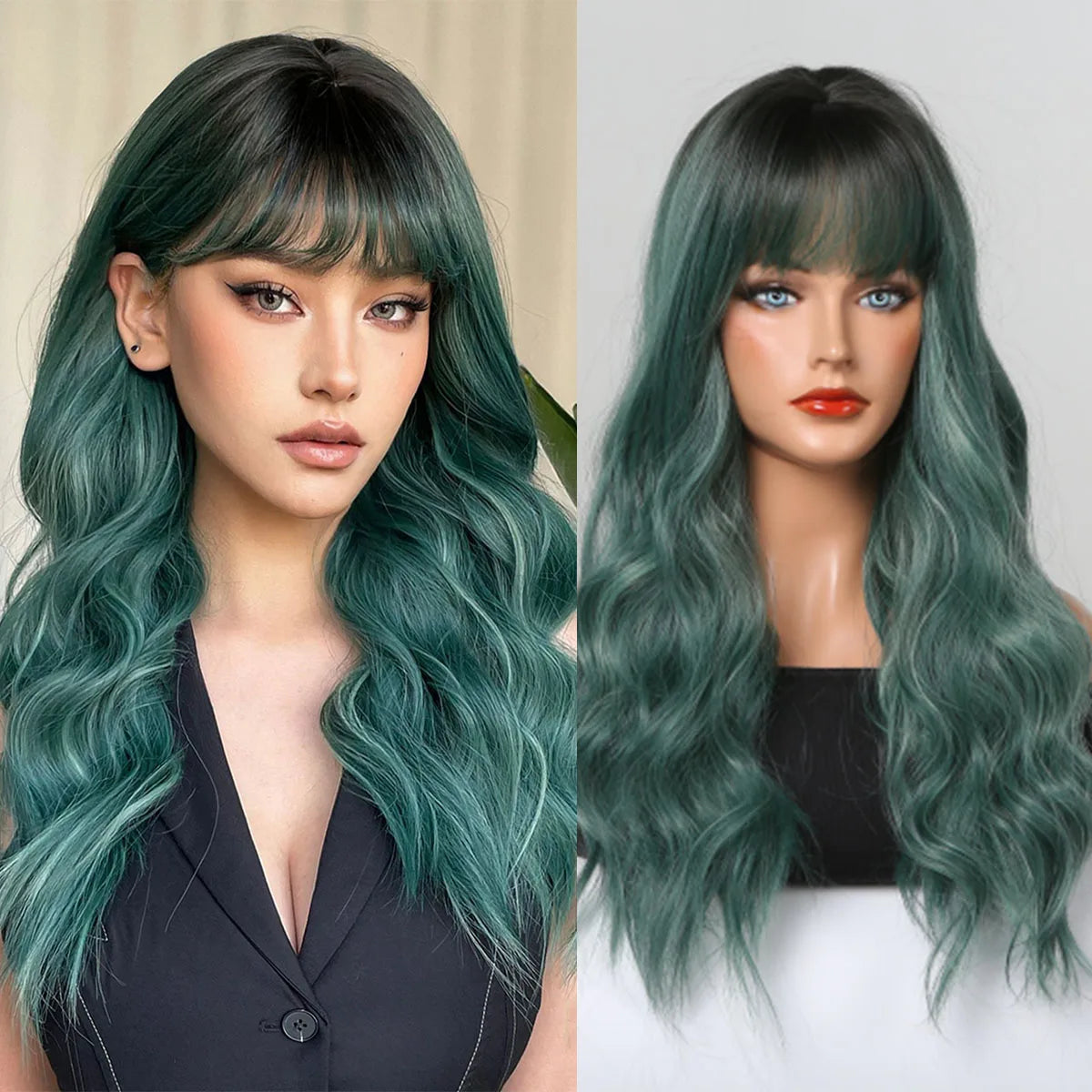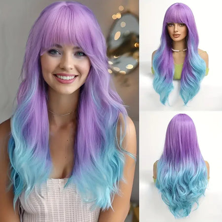 Long Wavy Layered Synthetic Wig with Brown Highlights and Side Bangs