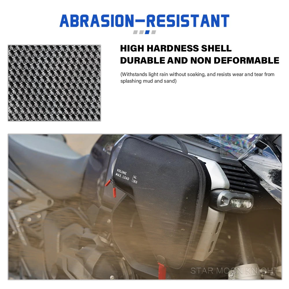 Keep your BMW R1300GS Adventure ready on the road with the Radiator Bags Waterproof Nylon Frame Bag Set. Specifically designed for the BMW R1300GS ADV (2024+), this black frame bag duo provides practical stowage for small items you need to access quickly while riding. The bags attach securely to the radiator cowl using three hooks—no strap required—so you stay lightweight and organized on every mile. Crafted from tear-resistant nylon with a waterproof inner bag and an EVA plastic lid, they hold their shape, resist weather, and stay clean in dirt-prone conditions.