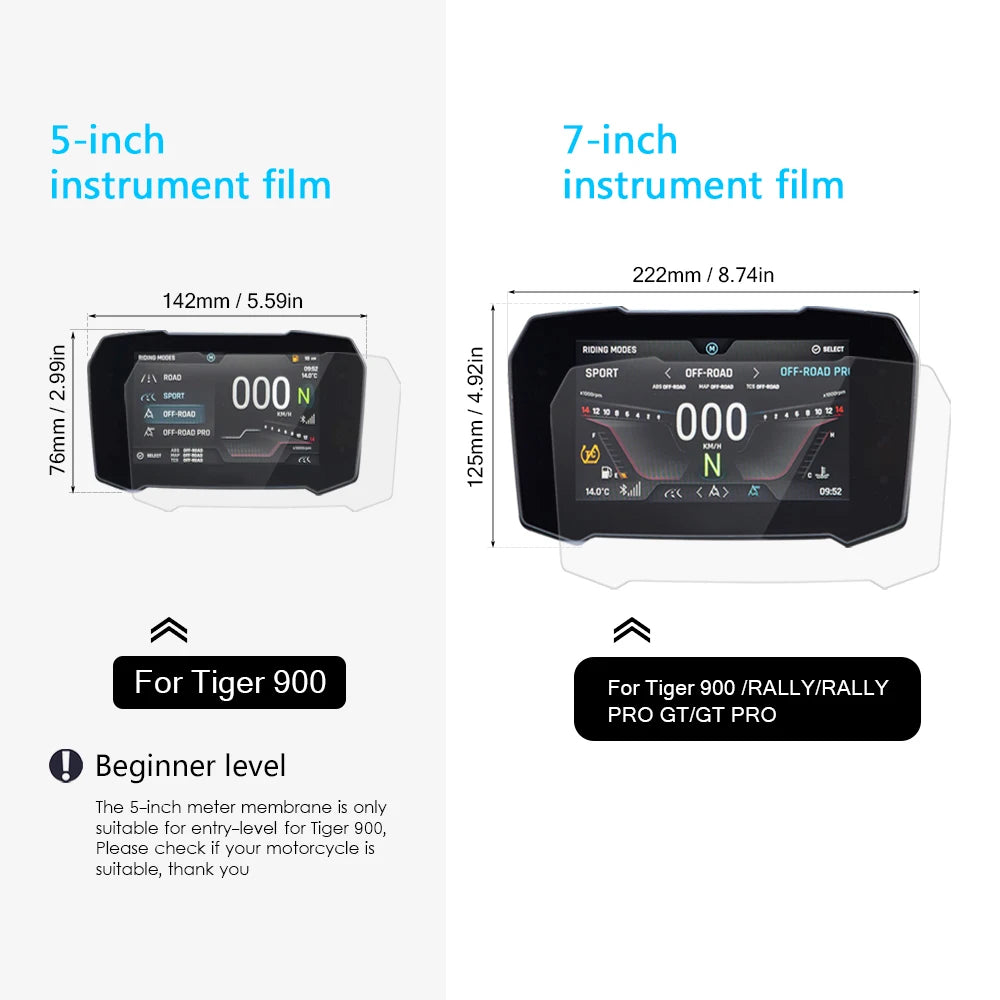 The film is tailored for multiple Tiger 900 configurations: 5 inches for the entry-level Tiger 900, and 7 inches for the Tiger 900 Rally, Rally Pro, GT, GT Low, and GT Pro (2020 models). Note: the 5-inch size is solely for the entry-level Tiger 900 and is not suitable for GT or Pro variants. Select the correct option to ensure a perfect fit.