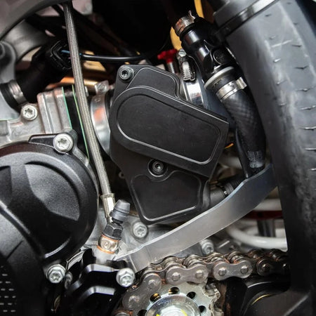 The Husqvarna Throttle Body Guard Cover is a rugged aluminum shield designed for Husqvarna TC TX 125/250/300 (2023–2024) and TE 150/250/300 (2024) models, with cross-brand fitment for KTM and GasGas bikes as listed. The original plastic guard often fails to fully cover the exposed throttle body and electrical connections. This precision-engineered aluminum TPS shield fills that coverage gap, protecting critical components where damage can occur during a crash or when debris flies up from the trail.