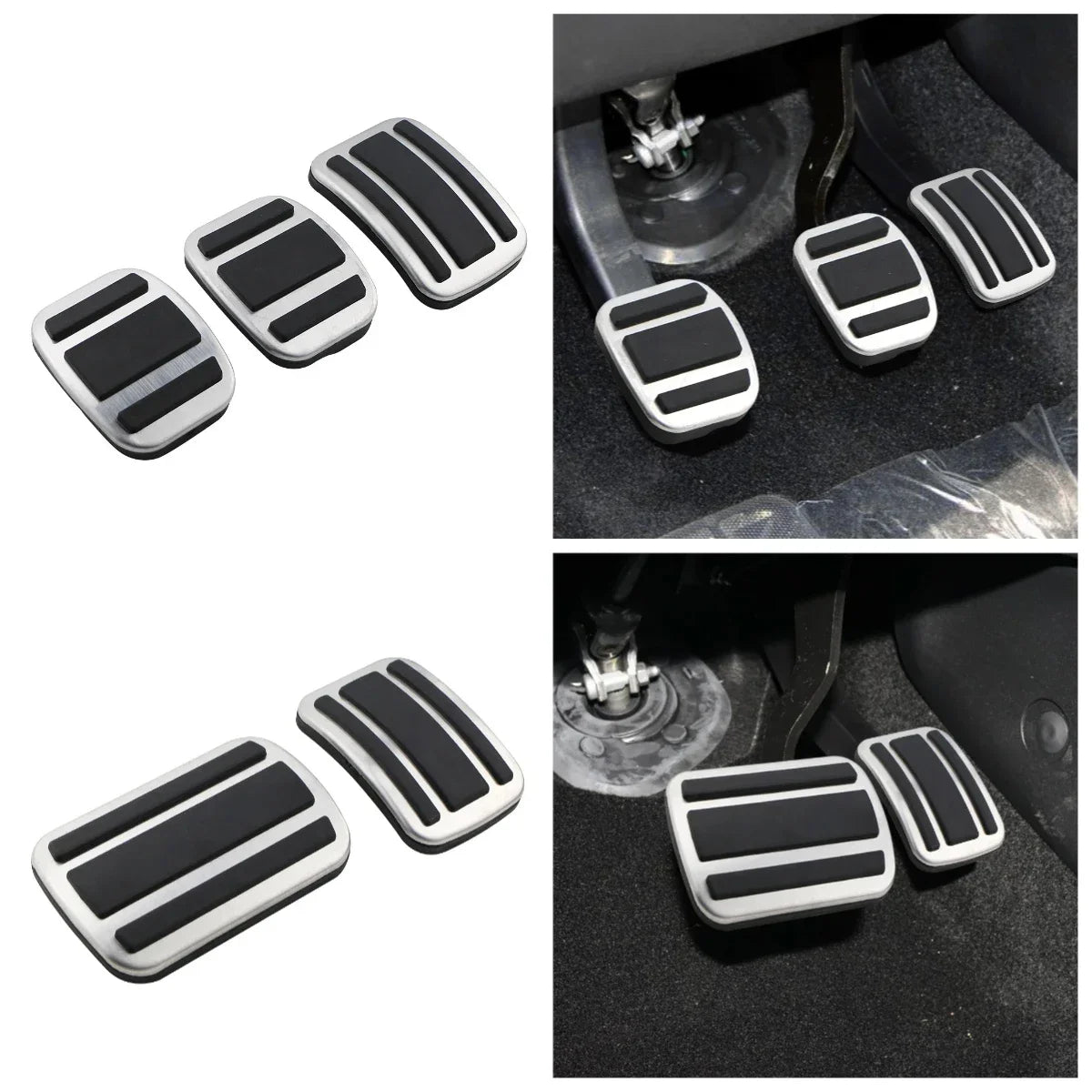 Installation is straightforward with no drilling or major car modifications required. For automatic transmissions (AT), replace the brake pedal by removing the original rubber cover and fit the new pedal; the gas pedal installs directly over the existing surface; the clutch pedal is installed in the same manner as the gas pedal if your vehicle is equipped with one. For manual transmissions (MT), the kit includes all necessary pedals (brake, gas, and clutch) to complete the upgrade.