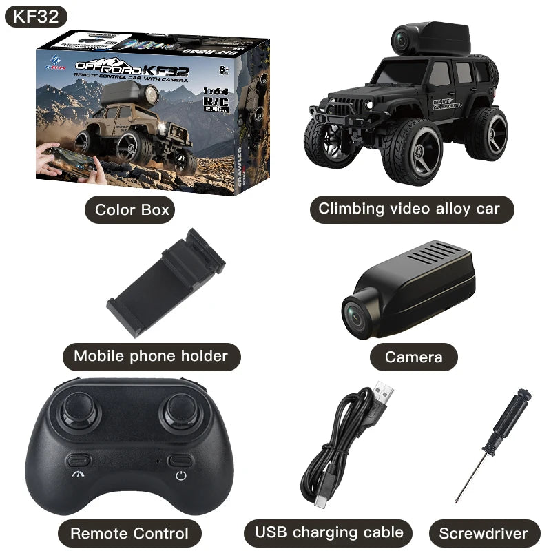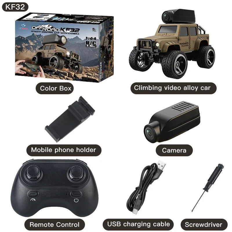 Meet the Teranty KF32, a compact 1:64 full-scale four-wheel-drive RC car designed for high-speed fun and immersive FPV racing. Its small footprint makes it perfect for indoor play or outdoor cruising on smooth surfaces, while the four-wheel-drive system and rugged build help it tackle light off-road challenges. The 720P FPV camera paired with a WiFi app lets you stream live video to your phone, so you can chase the action from the driver’s seat in real time. With a 2.4GHz full-scale synchronous control system (gun-style) and a generous 30-meter remote range, this tiny racer brings big thrills without cluttering your space.