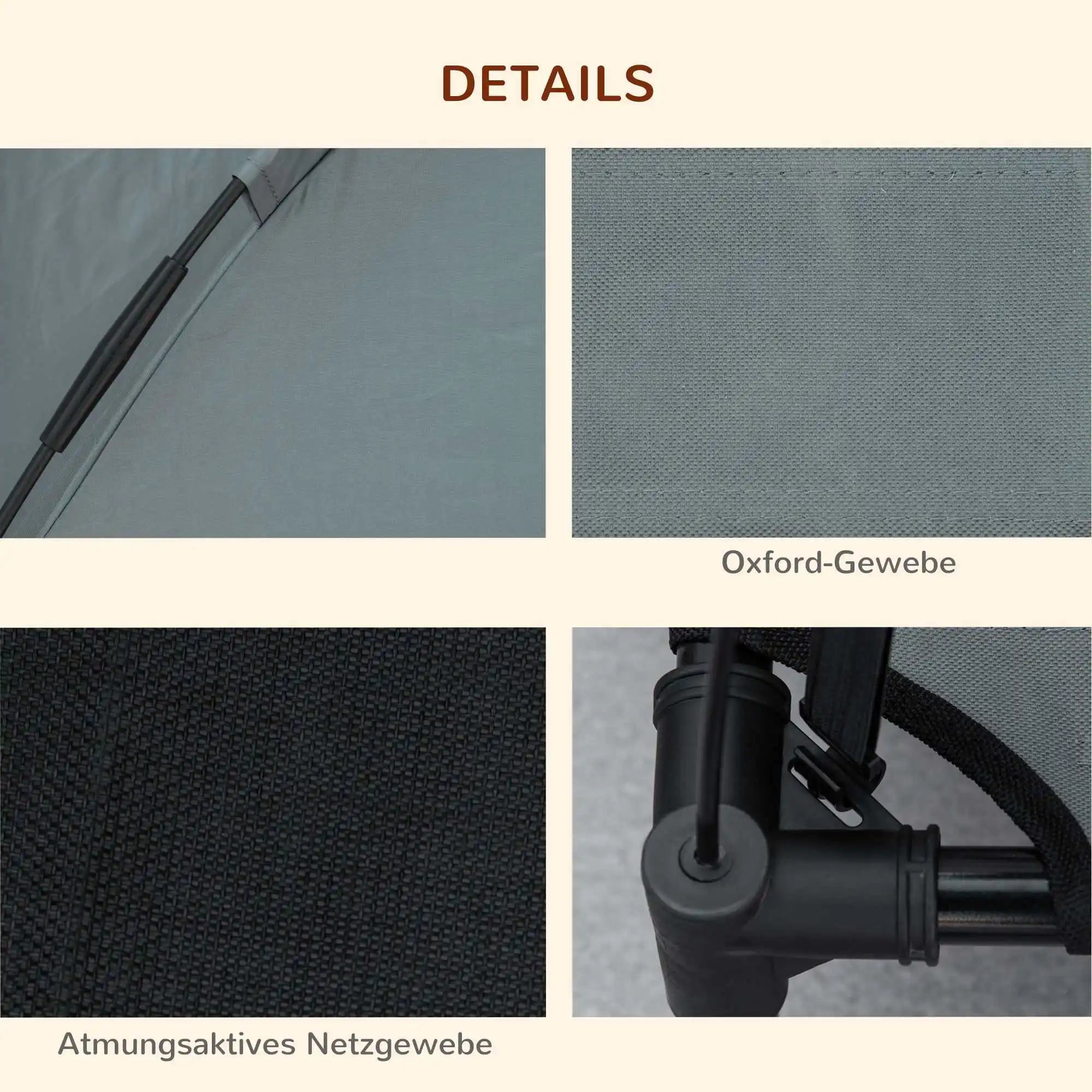 - Materials: Lying surface — oxford cloth and mesh fabric; Frame — powder-coated metal