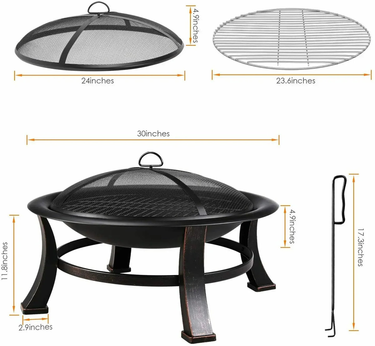 Meet the 30 Inch Round Firepit Bowl with BBQ Grill and Spark Screen — the perfect outdoor centerpiece that blends warmth, ambiance, and grilling capability. This wood-burning fire pit is designed for outdoor use, delivering cozy heat while you entertain under the stars. Built with a solid black steel coated metal frame, it’s durable, rust-resistant, and ready to withstand seasons of backyard use. The 22-inch diameter inner fire bowl provides a generous burn area, and the 30-inch overall footprint keeps a comfortable space for guests to gather around.