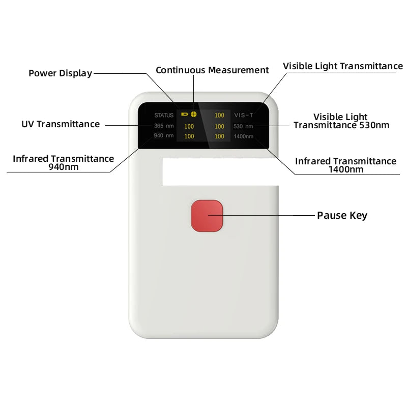 - Test Index: Ultraviolet (365 nm); Visible (380–760 nm, conform to CIE photopic function standard); Infrared (940 nm, 1400 nm)