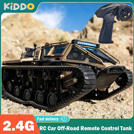 Experience rugged off-road action with the CONUSEA RC Tracked Tank Off-Road Car, a 2.4G remote-controlled vehicle built for outdoor adventures. Its tracked chassis delivers solid grip on grass, gravel, mud, and pavement, while four-channel MODE2 control lets you master precise forward/backward motion, left/right steering, and 360° spins. Realistic front and rear LED lights, plus interior atmosphere lighting and a roof phantom light, create immersive night runs. The doors open for added drama, and the roof light can be adjusted to suit the mood. With a top speed up to 8 km/h and a remote range of about 50 meters, this vehicle is perfect for solo sessions or family play, indoors or outdoors.