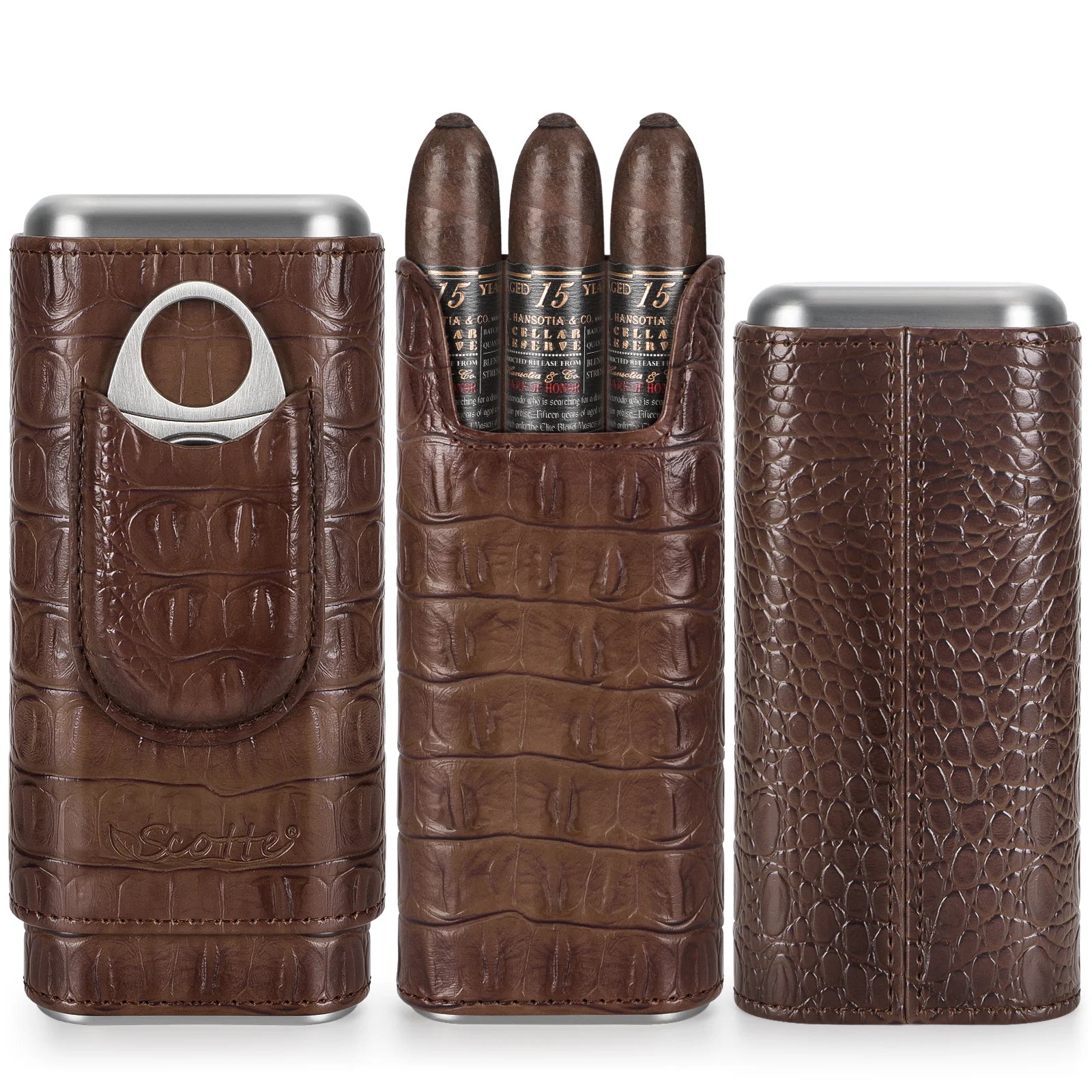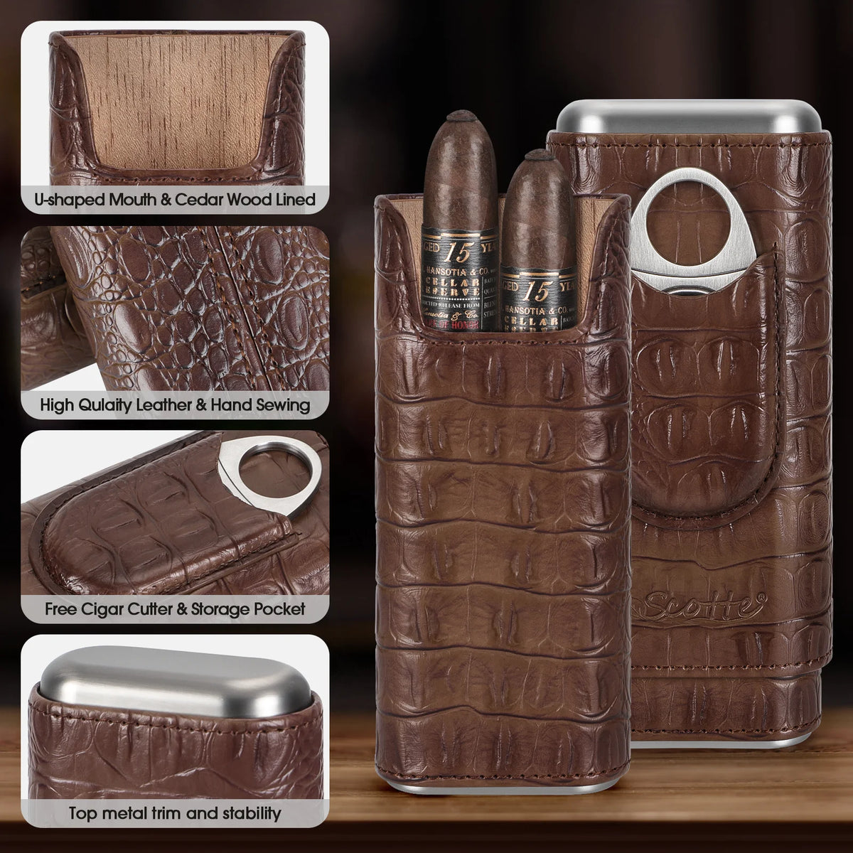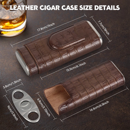 Meet the Scotte Leather Cigar Case Cedar Wood Humidor And Cutter—a refined travel companion for cigar lovers. Crafted from high-quality leather with a classic crocodile grain, this compact case is designed to protect and organize your cigars on the go. Cedar wood lining helps preserve aroma and condition, while a large U-shaped notch makes placing and removing cigars quick and easy. It comfortably holds 3-4 cigars, yet remains lightweight and portable for pockets, purses, or travel bags.