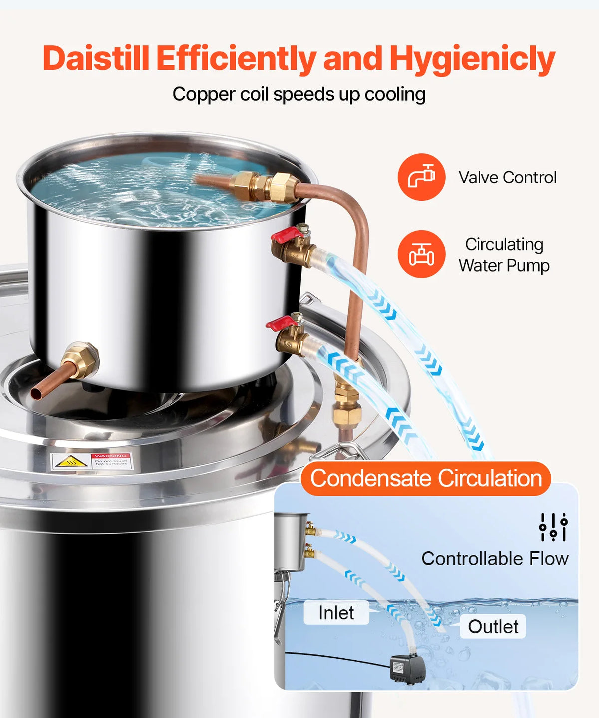 Exhaust valves and temperature gauges help you stabilize and control the distillation process. Tip: Alcohol turns into vapor at around 173°F, while water in fermented products turns into vapor at 212°F. With these guidelines, you can manage heat and separation to achieve smoother results. The high-quality copper coil inside the pipes promotes rapid cooling and reduces residue and aftertaste, and it can be paired with a water pump for steady condensate circulation. The barrel features reinforced sealing at the lids to minimize steam loss and prevent leaks, making this distiller a reliable choice for producing fruit wines, rum, vodka, distilled water, and other distilled products at home.