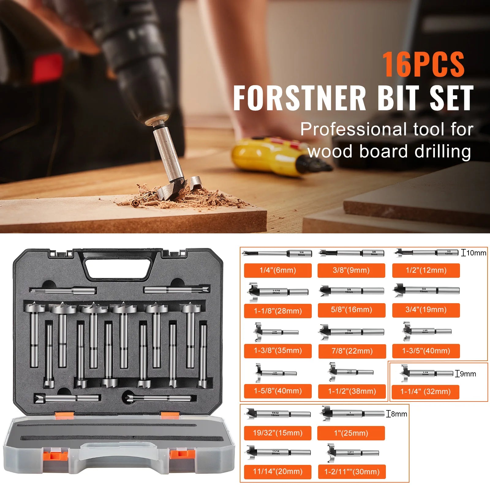 16Pcs Forstner Bit Set 1/4 To 1-5/8 Carbon Steel