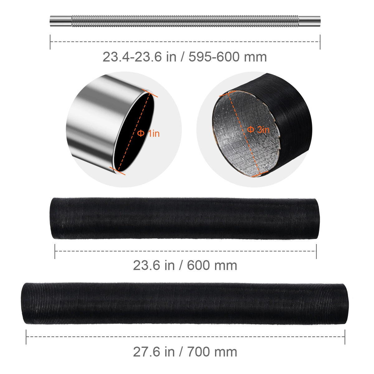 Enhance your diesel heater setup with the Diesel Heater Ducting Set, a versatile, extendable ducting kit designed for fast, safe, and efficient warm air delivery. The 3-inch outlet duct and rust-resistant exhaust pipe are built for durability, with a light-proof black exterior and high-temperature aluminum interior that withstands heat and tough environments. Extendable from 23.6 to 27.6 inches to fit a wide range of models, this kit delivers reliable performance for 2KW, 5KW, and 8KW diesel heaters, helping you heat cabins, workshops, or vehicles quickly and safely. Includes everything you need for a secure installation: exhaust pipe, outlet ducts, clamps, vent connectors, and a tee connector.