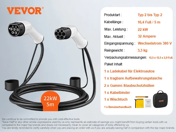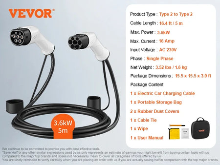 - Product Type: Type 2 to Type 2 (IEC 62196-2)