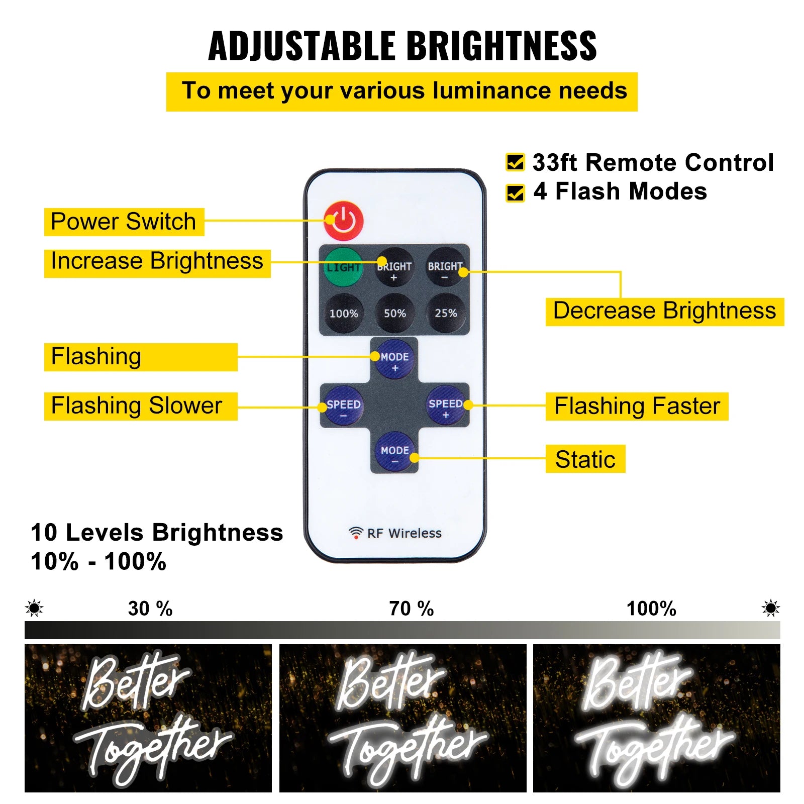 - Brightness: 10 levels (10%–100%)